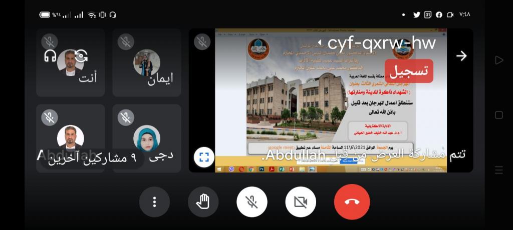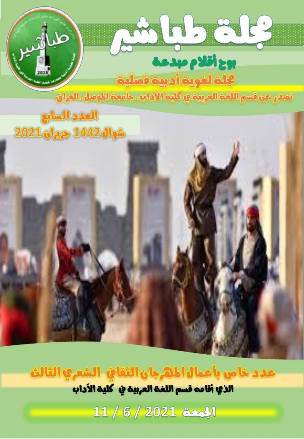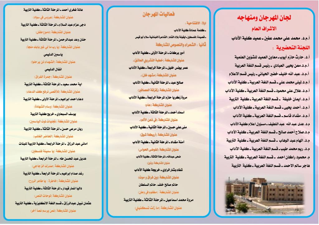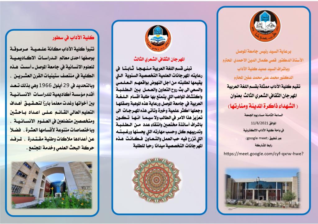 برعاية السيد رئيس جامعة الموصل الأستاذ الدكتور قصي كمال الدين الاحمدي المحترموبإشراف السيد عميد كلية الآداب الدكتور محمد علي محمد عفين المحترماقامت كلية الآداب ممثلة بقسم اللغة العربية المهرجان الثقافي الشعري الثالث بعنوان ( الشهداء ذاكرة المدينة ومنارتها) يوم الجمعة الموافق 11/6/2021 في باحة كلية الآداب الالكترونية عبر تطبيق (google meet) ، انطلق المهرجان بكلمة افتتاحية رحب بها عميد كلية الآداب الدكتور محمد علي محمد عفين بالمشاركين والحضور ، وشهد المهرجان حضورا كبيرا تخلله مداخلات من استاذة جامعات عراقية وعربية ابدت اعجابها بهذا النشاط الثقافي ، وفيما يأتي تفاصيل المهرجانملخص المهرجان واهدافه تبنى قسم اللغة العربية منهجا ثابتا في رعايته المهرجانات العلمية التخصصية السنوية التي يقيمها لطلبته من اجل النهوض بواقعهم العلمي والسعي الى بث روح التعاون والعمل بين الطلبة واكتشاف المواهب التي يتمتع بها طلبة اقسام اللغة العربية في جامعة الموصل ورعاية هذه الموهبة وصقلها وجعلها اكثر علمية وخبرة وتأتي هذه المهرجات الى تعزيز هذا الامر في الطالب ولا سيما انها تكون باشراف أساتذة مختصين وانتقاء عدد من الطلبة وتدريبهم كل وحسب مهارته التي يحسنها ورغبته التي تزرع فيه حب العمل والتعاون فكانت هذه المهرجانات التخصصية ميدانا رحبا للطلبةلجان المهرجان ومنهاجهالاشراف العامأ.م.د. محمد علي محمد عفين ـ عميد كلية الآداباللجنة التحضيرية :أ.د. حارث حازم أيوب ـ معاون العميد للشؤون العلميةأ.م.د.معن يحيى العبادي ـ رئيس قسم اللغة العربيةأ.م.د. عبد الله خليف خضير الحياني ـ رئيس قسم الاعلامأ.م.د.ليلى محمد علي ـ قسم اللغة العربية ـ كلية الآدابأ.م.د. هلال علي محمود ـ قسم اللغة العربية ـ كلية الآدابأ.م.د. ايمان خليفة ـ قسم اللغة العربية ـ كلية التربيةأ.م.د. أحمد يحيى ـ قسم اللغة العربية ـ كلية الآدابأ.م.د. مقداد قاسم ـ قسم اللغة العربية ـ كلية الآدابم.د. هدى عبد الله عبد اللطيف ـ مسؤول اعلام كلية الآدابم.د.صلاح أحمد صالح ـ قسم اللغة العربية ـ كلية الآدابم.د. الهام عبد الوهاب ـ قسم اللغة العربية ـ كلية التربيةم.د. ريم محمد طيب ـ قسم اللغة العربية ـ كلية الآدابم. محمود راكان احمد ـ قسم اللغة العربية ـ كلية التربيةهاجر سالم الاحمد ـ قسم اللغة العربية ـ كلية التربيةفعاليات المهرجاناولا: الافتتاحية :ـ كلمة عمادة كلية الآدابـ قصيدة (فلسطين ـ ايقونة بلاد الشام ) الشاعرة اللبنانية سلام أبو قيسثانيا : الشعراء والنصوص المشاركةأمير بركات ـ المرحلة الأولى ـ كلية الآدابعنوان المشاركة (خطبة التشريني العاشق).عمر يونس خليل ـ المرحلة الرابعة ـ كلية الآدابعنوان المشاركة (مشهد ظلّ).صالح عبد ـ المرحلة الثانية ـ كلية الآدابعنوان المشاركة (زقزقة العصافير)مروة زكريا حازم المرحلة الرابعة ـ كلية الآدابعنوان المشاركة (عام)اسماء أحمد ـ المرحلة الثالثة ـ كلية الآدابعنوان المشاركة (في ذهن الألم).منى علي حسين ـ المرحلة الثانية ـ كلية الآدابعنوان المشاركة (أريكة شوق)آمنة مقداد ـ المرحلة الثانية ـ كلية الآدابعنوان المشاركة (لفوضى الحواس)ضحى عبدالله ـ المرحلة الثالثة ـ كلية الآدابعنوان المشاركة (وتين)شفاء بشار الراوي ـ خريجة كلية الآدابعنوان المشاركة (بين فراق و موت)حاتم صالح خلف. حاتم السلطانعنوان المشاركة (مظلوم في وطن)مروة محمد اسماعيل ـ المرحلة الثالثة ـ كلية التربيةعنوان المشاركة (ما زلت تسكنيني)هالة فخري أحمد ـ المرحلة الثالثة ـ كلية التربيةعنوان المشاركة (عروس في سواد)دجى عزام عبد السلام ـ المرحلة الثالثة ـ كلية التربيةعنوان المشاركة (دموع طفل)حنان وعد عبدالرحمن ـ المرحلة الثالثة ـ كلية التربيةعنوان المشاركة (يا رب ما لي غير بابك ملجأ)ياسمين الدليميعنوان المشاركة (الشهداء لن يرحلوا)انفال الدليميعنوان المشاركة (جمرة الفراق)اية محمد سعيد ـ المرحلة الثالثة ـ كلية التربيةعنوان المشاركة (للأقصى نرفع كف الدعاء)دعاء احمد ابر