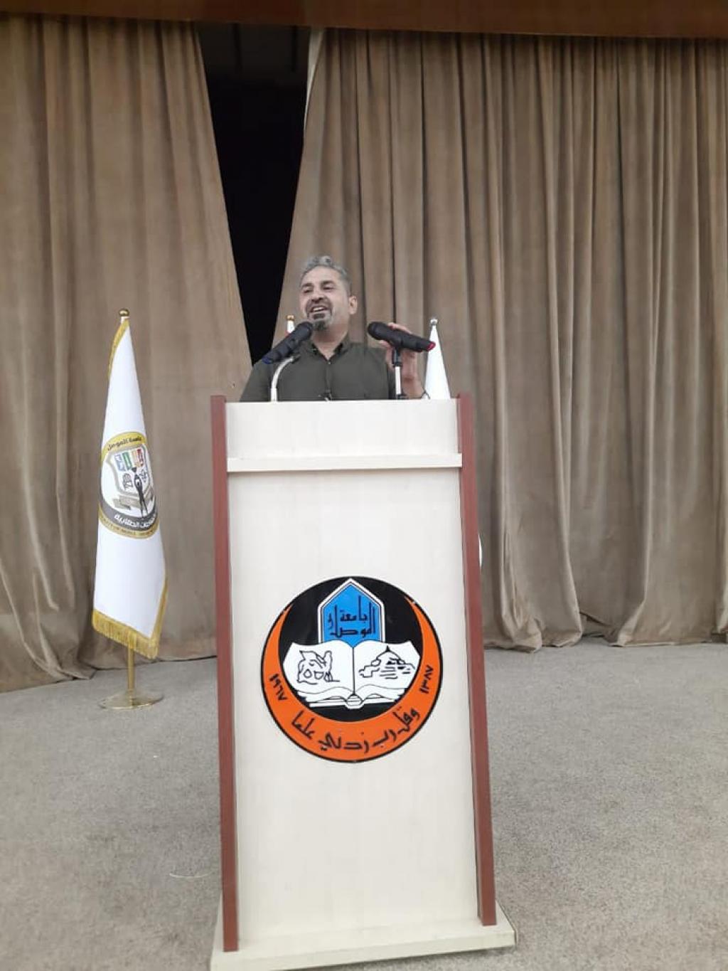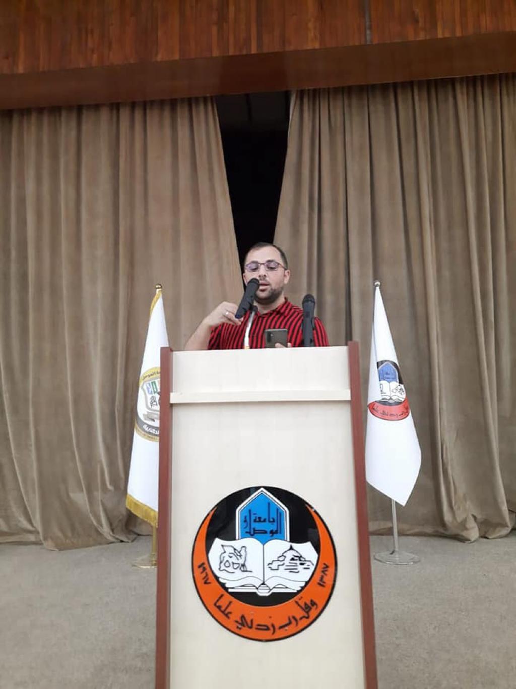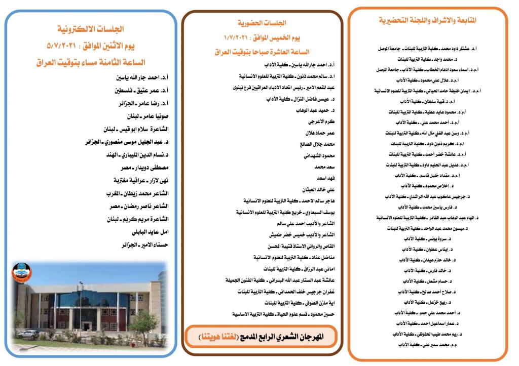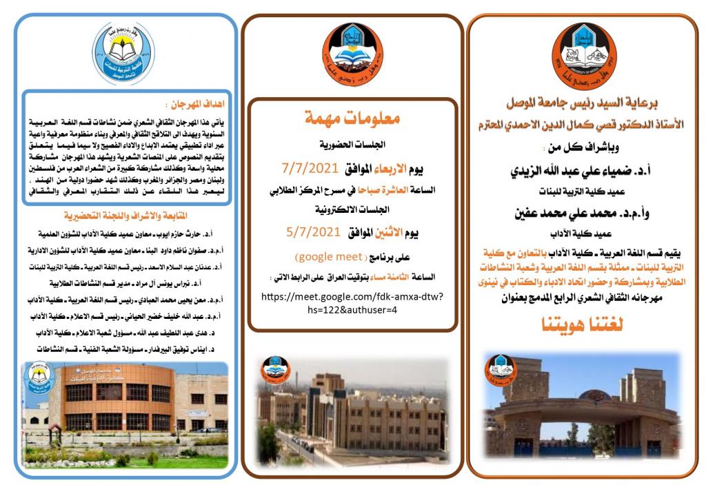 برعاية السيد رئيس جامعة الموصل الأستاذ الدكتور قصي كمال الدين الاحمدي المحترموبإشراف كل من :أ.د. ضمياء علي عبد الله الزيدي ـ عميد كلية التربية للبناتوأ.م.د. محمد علي محمد عفين ـ عميد كلية الآداباقام قسم اللغة العربية ـ كلية الآداب بالتعاون مع كلية التربية للبنات ممثلة بقسم اللغة العربية وشعبة النشاطات الطلابية وبمشاركة وحضور اتحاد الادباء والكتاب في نينوى مهرجانه الثقافي الشعري الرابع المدمج بعنوان : (لغتنا هويتنا)اذ انطلقت الجلسات الحضورية اليوم الاربعاء الموافق 7/7/2021 الساعة العاشرة صباحا في مسرح المركز الطلابي وسبقتها الجلسات الالكترونية يوم الاثنين الموافق 5/7/2021 على برنامج( google meet) الساعة الثامنة مساء بتوقيت العراقاهداف المهرجان واهميته :يأتي هذا المهرجان الثقافي الشعري ضمن نشاطات قسم اللغة العربية السنوية ويهدف الى التلاقح الثقافي والمعرفي وبناء منظومة معرفية واعية عبر اداء تطبيقي يعتمد الابداع والاداء الفصيح ولا سيما فيما يتعلق بتقديم النصوص على المنصات الشعرية ويشهد هذا المهرجان مشاركة محلية واسعة وكذلك مشاركة كبيرة من الشعراء العرب من فلسطين ولبنان ومصر والجزائر والمغرب وكذلك شهد حضورا دولية من الهند ، ليعبر هذا اللقاء عن ذلك التقارب المعرفي والثقافيتكمن اهميته في كونه اضخم تجمع ثقافي شعري لشعراء عراقيين وعربادار التقديم والاعدادا.د. احمد جار الله ياسينا.م.د. عبدالله خليف الحيانيوشارك فيه نخبة من المبدعين من جامعة الموصل وخارجها وهم كل منأ.د. احمد جارالله ياسين ـ كلية الآدابا.د. سالم محمد ذنون ـ كلية التربية للعلوم الانسانيةعبد المنعم الامير ـ رئيس اتحاد الادباء العراقيين فرع نينوىد. عيسى فاضل النزال ـ كلية الآدابعمر حماد هلالمحمد جلال الصائغمحمود المشهدانيسعد محمدفهد اسعدعلي خالد العيثانالشاعر والأديب احمد علي سالمالشاعر والأديب خميس خضر طميشمناضل عناد ـ كلية التربية للعلوم الانسانيةاماني عبد الرزاق ـ كلية التربية للبناتعائشة عبد الستار عبد الله البدراني ـ كلية الفنون الجميلةغفران جرجيس خلف الحمداني ـ كلية التربية للبناتاية مازن الصوفي ـ كلية التربية للبناتحسين محمود ـ قسم علوم الحياة ـ كلية التربية الاساسية