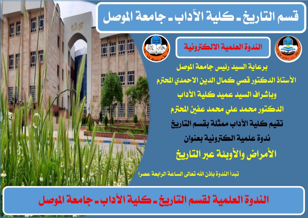 برعاية السيد رئيس جامعة الموصل الأستاذ الدكتور قصي كمال الدين الاحمدي المحترموبإشراف السيد عميد كلية الآداب الدكتور محمد علي محمد عفين المحترماقامت كلية الآداب ممثلة بقسم التاريخ ندوة علمية الكترونية بعنوان ( الأمراض والأوبئة عبر التاريخ ) يوم الخميس الموافق 28 / 5 / 2020 الساعة الرابعة عصرا على تطبيق (Google meet) ، وفيما يأتي تفاصيل الندوة واسماء المشاركين فيها :اولا ـ الاهداف والموضوع : تسلط هذه الندوة الضوء على تاريخ الاوبئة والامراض عبر حقب التاريخ المختلفة وطبيعة الاستجابات البشرية لها كما اهتمت الندوة بإبراز دور الحضارة العربية الاسلامية في مواجهة الاوبئة والامراض التي اجتاحت العالم الاسلامي في التاريخ الوسيط والحديث وابرزت الندوة اهمية التاريخ في ترسيخ الوعي بخطورة الاوبئة والامراض والمعالجات الضرورية اللازمة لها ومن هذه المنطلقات جاءت الاوراق البحثية في هذه الندوة لتكرس رؤية التاريخ للأوبئة والامراض وتقترح المعالجات اللازمة لها .ثانيا ـ اللجنة التحضيرية