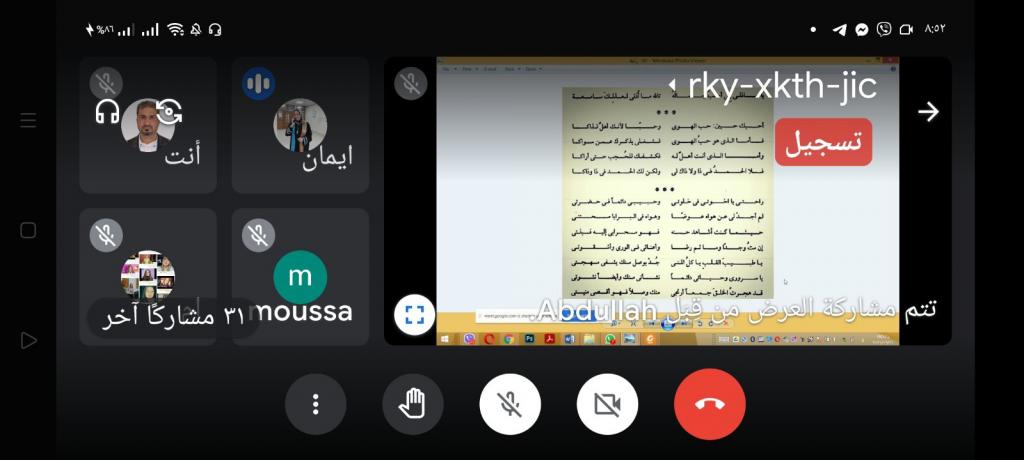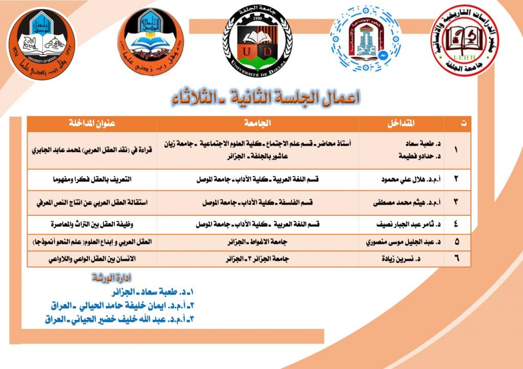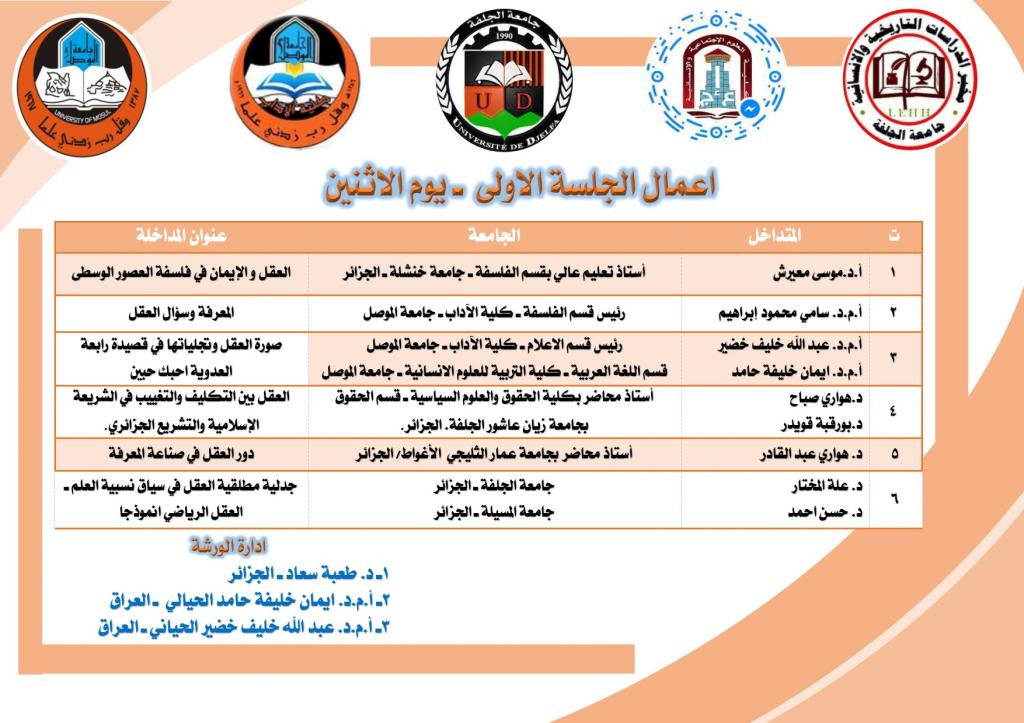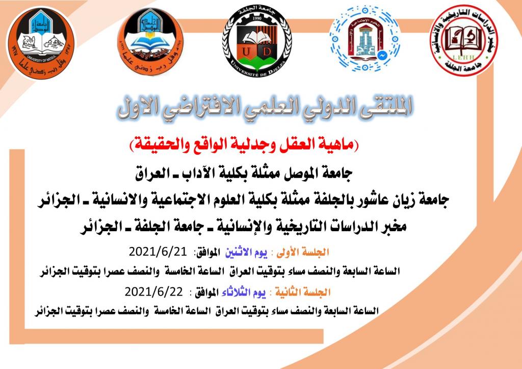 برعاية كل من : الأستاذ الدكتور قصي كمال الدين الاحمدي المحترم ـ رئيس جامعة الموصل ـ العراقوالأستاذ الدكتور عيلام الحاج المحترم ـ رئيس جامعة زيان عاشور بالجلفة ـ الجزائروباشراف كل من : الدكتور محمد علي محمد عفين المحترم ـ عميد كلية الآداب ـ جامعة الموصلوالدكتورة قنشوبة عبد الرحمان ـ عميد كلية العلوم الاجتماعية والنفسية ـ جامعة زيان عاشور اقامت كلية الآداب ـ جامعة الموصل ـ العراق بالتعاون مع جامعة زيان عاشور بالجلفة ممثلة بكلية العلوم الاجتماعية والإنسانية ـ الجزائر ومخبر الدراسات التاريخية والإنسانية ـ جامعة الجلفة ـ الجزائر الملتقى الدولي العلمي الافتراضي الاول (ماهية العقل وجدلية الواقع والحقيقة) ، وانطلقت اعمال الملتقى اليوم الاثنين 18 / 6 / 2021م ، عبر (google meet) ، وفيما يأتي تفاصيل الملتقى :أولا : اهداف الملتقى :حمل الملتقى الدولي العلمي الافتراضي الاول (ماهية العقل وجدلية الواقع والحقيقة) شعار (نلتقي لنرتقي) هذا الشعار الذي رفعته جامعة الموصل ـ العراق وجامعة زيان عاشور بالجلفة ـ الجزائر للتأكيد على الدور العلمي والمعرفي في التواصل ولا سيما أن هذا اللقاء مثل جسرا ليربط مشرق الوطن العربي بمغربه لتبادل المعارف والثقافات وتوحيد الافكار ، فكل لقاء هو وحدة فكرية وقومية وعلمية ، وجاء هذا الملتقى ليمثل الجانب الواقعي لهذا التبادل المعرفي والعلمي الكبير بين الجامعات العربية وفي مختلف التخصصات العلمية من لغة عربية وفلسفة واجتماع وغيرها من التخصصات التي تسهم في الرفد المعرفي والعلمي ، كما تحاول الوقوف على سؤال قديم في العقل وعلاقته بالمعرفة، فضلا عن موقف الفلسفة من العقل؛ ونظرة العقل إلى الكثير من المسائل المفاهيمية وموقف الإنسان منها بين الأخذ والرد وتأثيرها في المتلقي للمعارف لما له من انعكاس حتمي على السلوك لتقترب كلها بالنهاية من القدرة على استيعاب الموضوع لغويا وفكريا ومعرفياثانيا ـ برنامج الملتقى :ـ كلمة السيد عميد كلية الآداب الدكتور محمد علي محمد عفين الكلمة الافتتاحية الترحيبية التي لخص فيها اهداف الملتقى ودوره في تعميق التعاون العلمي والمعرفيـ كلمة رئيس اللجنة العلمية للملتقى الدكتورة طعبة سعاد من الجزائر اعمال الجلسة الأولى : يوم الاثنين الموافق: 2021/6/21أ.د.موسى معيرش ـ أستاذ تعليم عالي بقسم الفلسفة ـ جامعة خنشلة ـ الجزائر ، عنوان المشاركة : العقل و الإيمان في فلسفة العصور الوسطىأ.م.د. سامي محمود إبراهيم ـ رئيس قسم الفلسفة ـ كلية الآداب ـ جامعة الموصل ، عنوان المشاركة : المعرفة وسؤال العقلأ.م.د. عبد الله خليف خضير ـ رئيس قسم الاعلام ـ كلية الآداب ـ جامعة الموصل ، وأ.م.د. ايمان خليفة حامد ـ قسم اللغة العربية ـ كلية التربية للعلوم الانسانية ـ جامعة الموصل ، عنوان المشاركة : صورة العقل وتجلياتها في قصيدة رابعة العدوية احبك حبيند.هواري صباح ، ود.بورقبة قويدر ، أستاذ محاضر بكلية الحقوق والعلوم السياسية ـ قسم الحقوق بجامعة زيان عاشور الجلفة. الجزائر ، عنوان المشاركة : العقل بين التكليف والتغييب في الشريعة الإسلامية والتشريع الجزائري.د. هواري عبد القادر أستاذ محاضر بجامعة عمار الثليجي الأغواط/ الجزائر ، عنوان المشاركة : دور العقل في صناعة المعرفةد. عبد الجليل موسى منصوري جامعة الاغواط ـ الجزائر ، عنوان المشاركة : العقل العربي و إبداع العلوم ( علم النحو أنموذجا) الجلسة الثانية : ستكون يوم الثلاثاء الموافق : 2021/6/22د. طعبة سعاد ، ود. حدادو فطيمة ، أستاذ محاضر ـ قسم علم الاجتماع ـ كلية العلوم الاجتماعية ـ جامعة زيان عاشور بالجلفة ـ الجزائر ، عنوان المشاركة : قراءة في (نقد العقل العربي) لمحمد عابد الجابريأ.م.د. هلال علي محمود ، قسم اللغة العربية ـ كلية الآداب ـ جامعة الموصل ، عنوان المشاركة : التعريف بالعقل فكرا ومفهوماأ.م.د. هيثم محمد مصطفى ،قسم الفلسفة ـ كلية الآداب ـ جامعة الموصل ، عنوان المشاركة : استقالة العقل العربي عن انتاج النص المعرفيد. ثامر عبد الجبار نصيف ، 