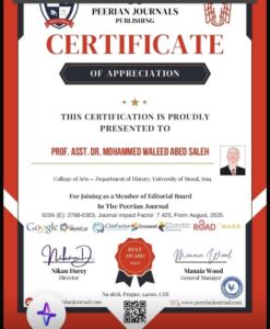 رشحت مجلة Peerian Journal Notification الدولية، الصادرة من العاصمة التشيكية براغ، الأستاذ المساعد الدكتور محمد وليد عبد، التدريسي في قسم التاريخ بكلية الآداب – جامعة الموصل، ليكون عضواً في هيئة تحريرها. في خطوة تعكس مكانة الكفاءات الأكاديمية العراقية وحضورها الفاعل في الساحة العلمية الدولية، وانسجاماً مع توجهات جامعة الموصل في تشجيع البحث العلمي وتعزيز الانفتاح والتعاون الدولي في مجالات الدراسات الإنسانية والاجتماعية.