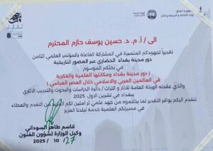 نال الأستاذ المساعد الدكتور حسين يوسف حازم، التدريسي في كلية الآداب – قسم التاريخ، كتاب شكر وتقدير من لدن معالي وزير الثقافة والسياحة والآثار، تثميناً لجهوده العلمية ومشاركته الفاعلة في المؤتمر العلمي الدولي الثامن الموسوم «دور مدينة بغداد الحضاري عبر العصور التاريخية»، الذي عُقد في العاصمة بغداد بتاريخ 27/10/2025.