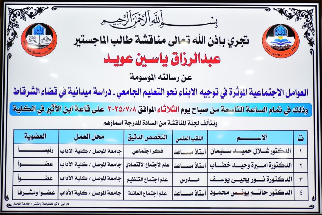 تتقدم عمادة كلية الآداب ممثلةً بعميدها الأستاذ الدكتور حاتم فهد الطائي بأحرّ التهاني وأطيب التبريكات إلى الدكتور أحمد طه أحمد، التدريسي في قسم اللغة العربية بمناسبة ترقيته العلمية الى مرتبة أستاذ مساعد– تخصص النثر العربي الحديث ونقده، متمنين له دوام التألق والنجاح في مسيرته الأكاديمية والعلمية، ومزيداً من العطاء في خدمة البحث العلمي ورفعة الكلية والجامعة.