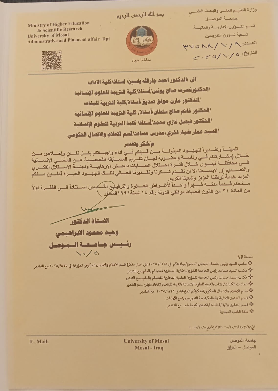 وجاء هذا التكريم ضمن احتفالات جامعة الموصل باليوم الوطني العراقي، التي شهدت أيضاً إعلان نتائج المسابقة الأدبية، تقديراً لدور الأدب في توثيق الذاكرة الوطنية وتعزيز روح الانتماء.