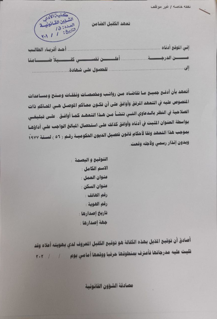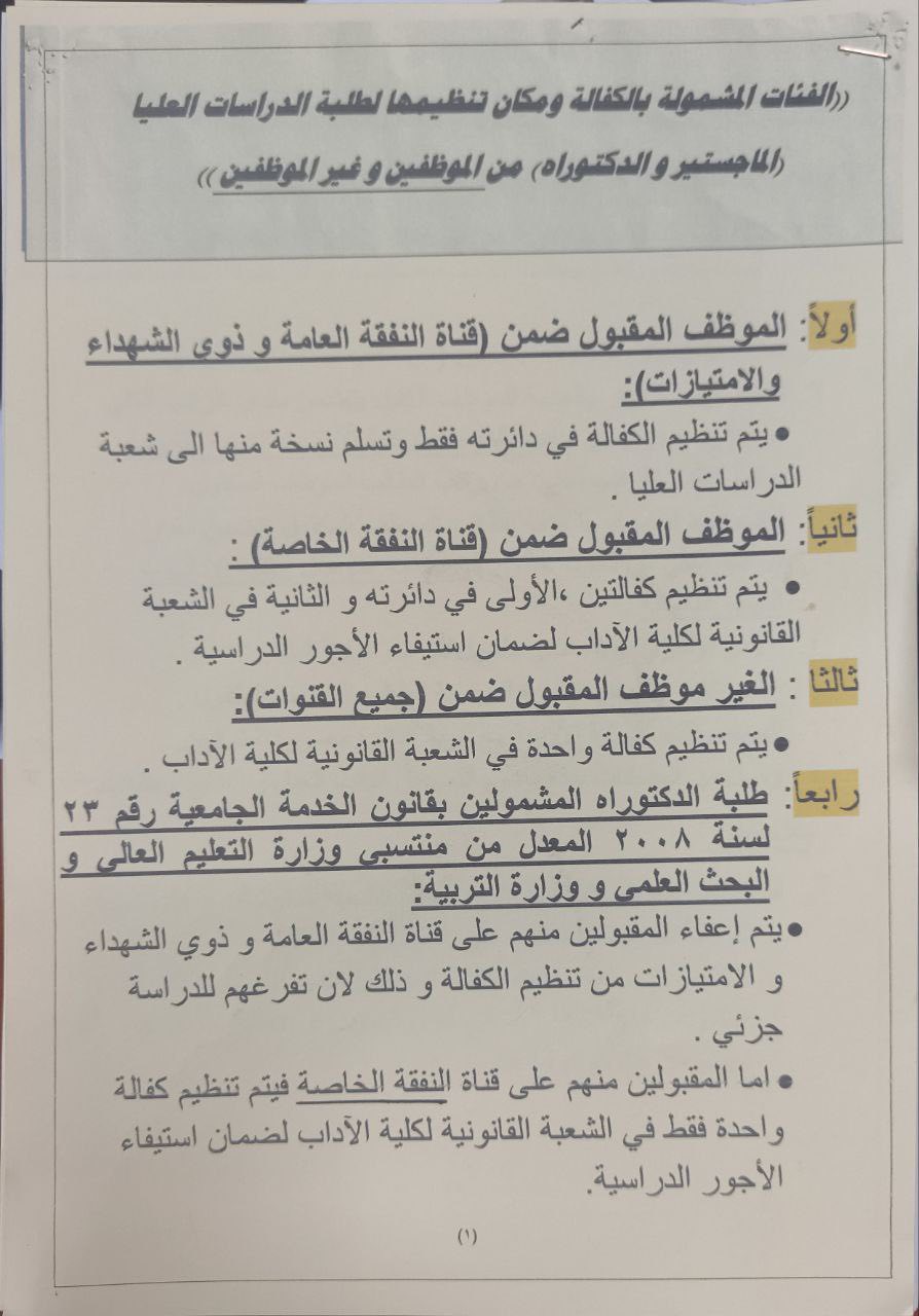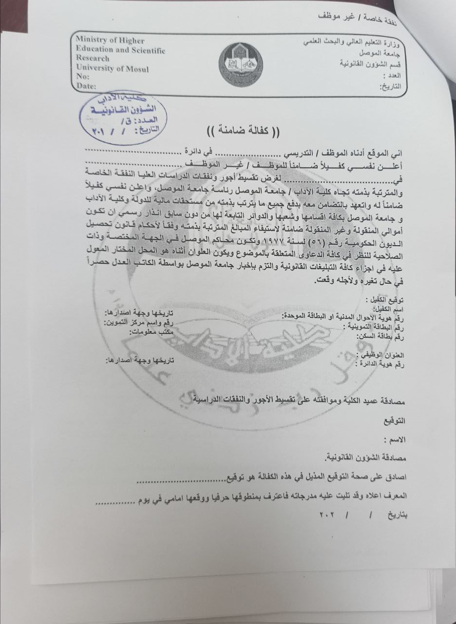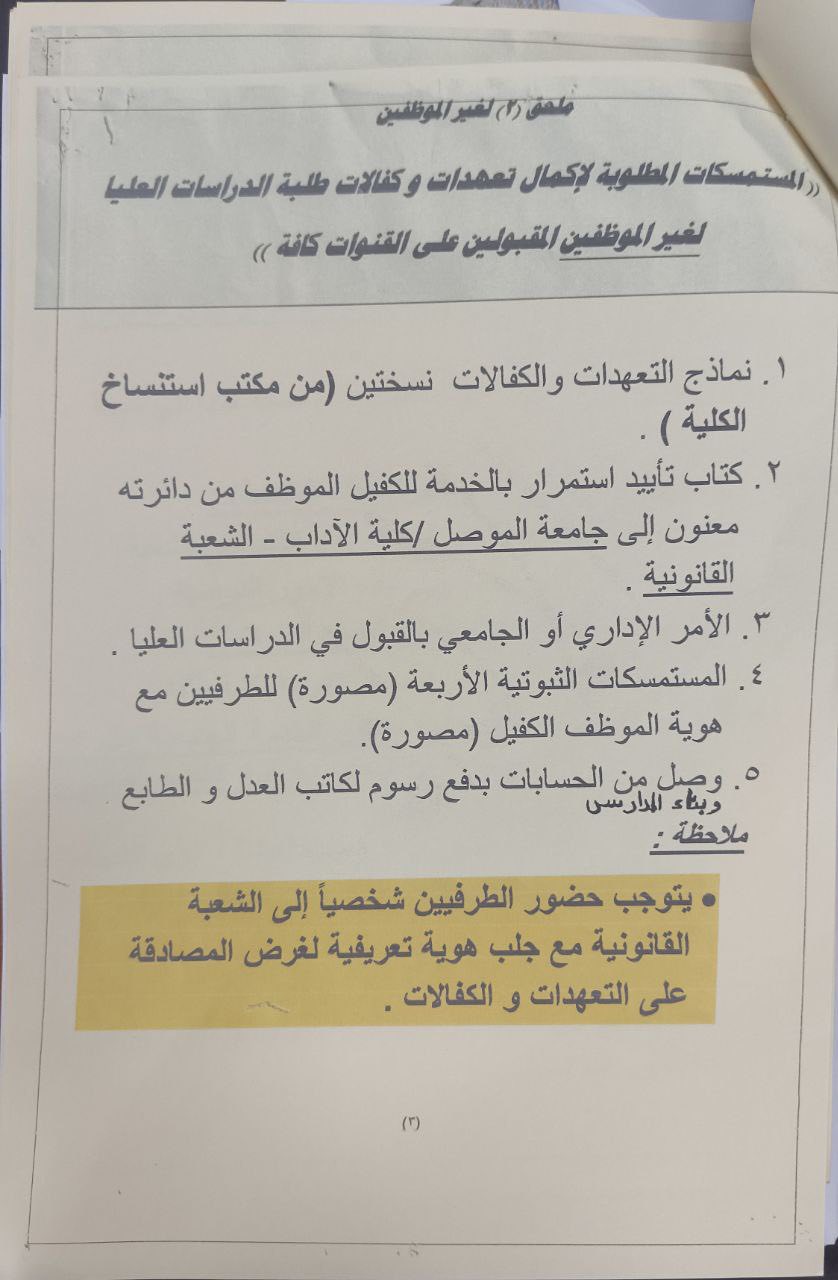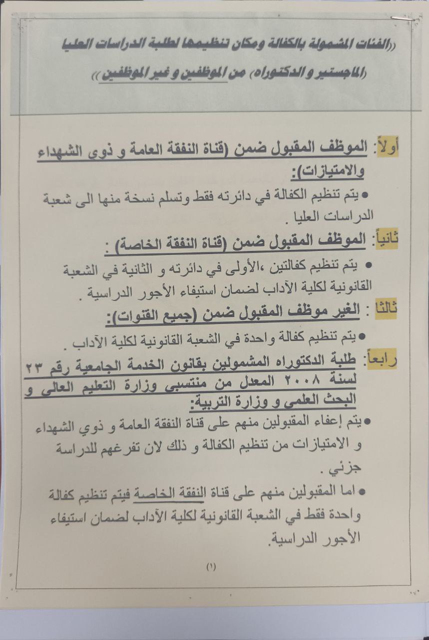 تُهيب كلية الآداب بالطلبة المقبولين في برامج الدراسات العليا، ( الذين صدرت أوامرهم الجامعية بالقبول )، بضرورة مراجعة الشعبة القانونية في الكلية للاطلاع على الأدلة الإرشادية الخاصة بالفئات المشمولة بإجراءات الكفالات والتعهدات القانونية، والمرفقة في المنشور أدناه.