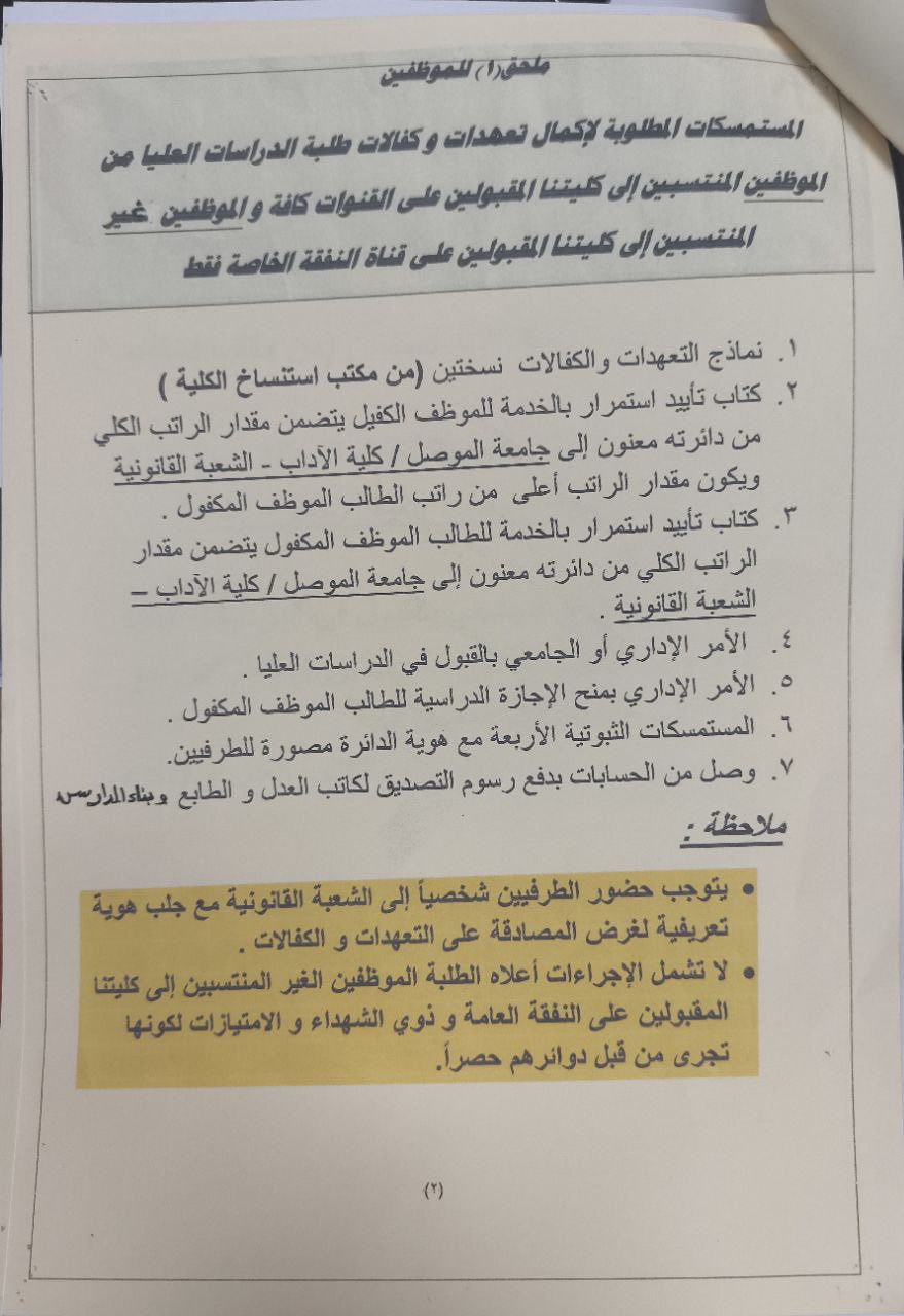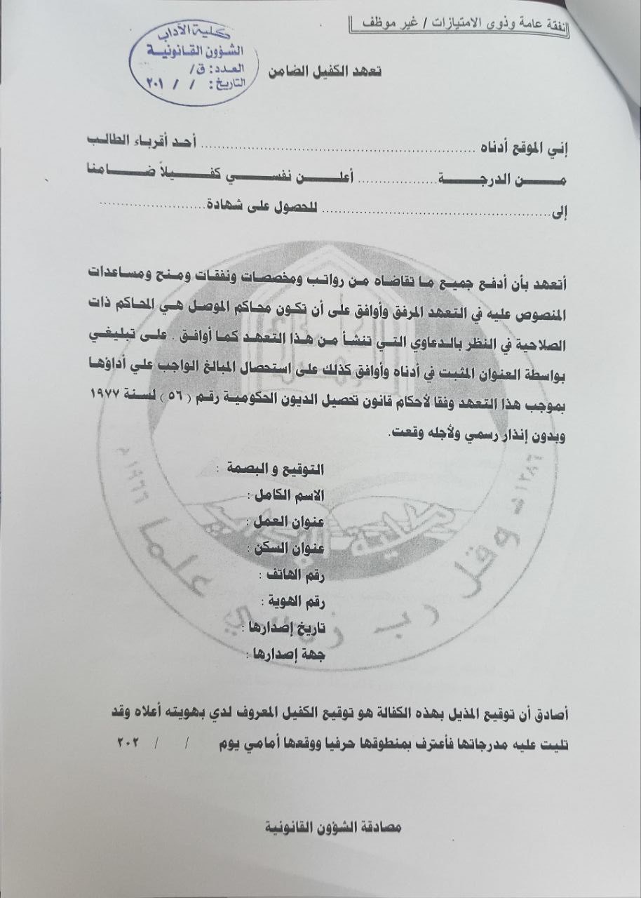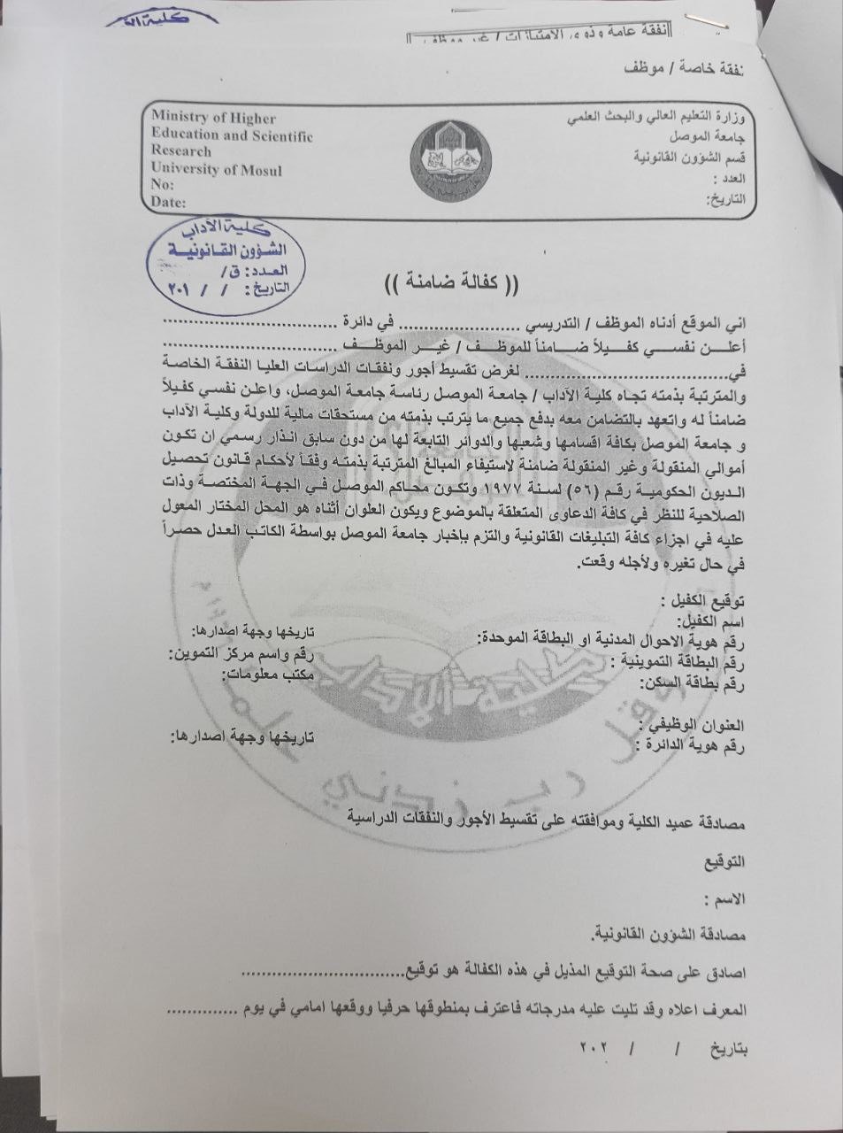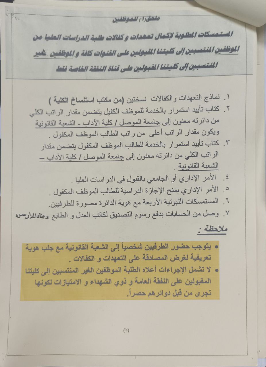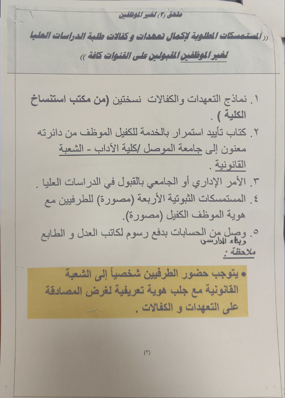 تُهيب كلية الآداب بالطلبة المقبولين في برامج الدراسات العليا، ( الذين صدرت أوامرهم الجامعية بالقبول )، بضرورة مراجعة الشعبة القانونية في الكلية للاطلاع على الأدلة الإرشادية الخاصة بالفئات المشمولة بإجراءات الكفالات والتعهدات القانونية، والمرفقة في المنشور أدناه.