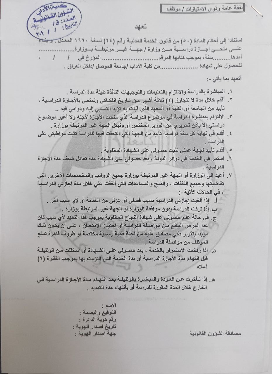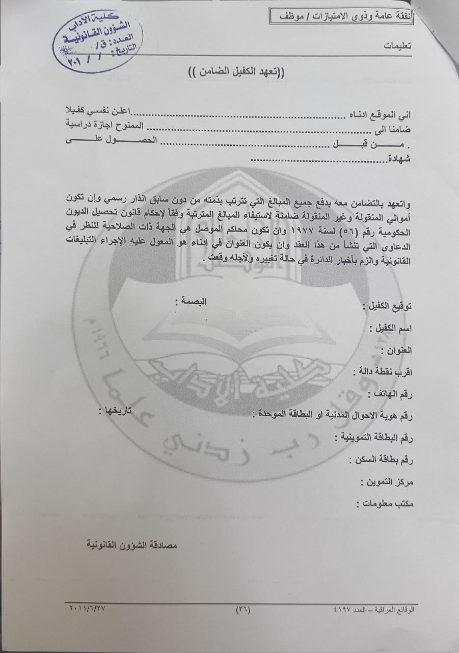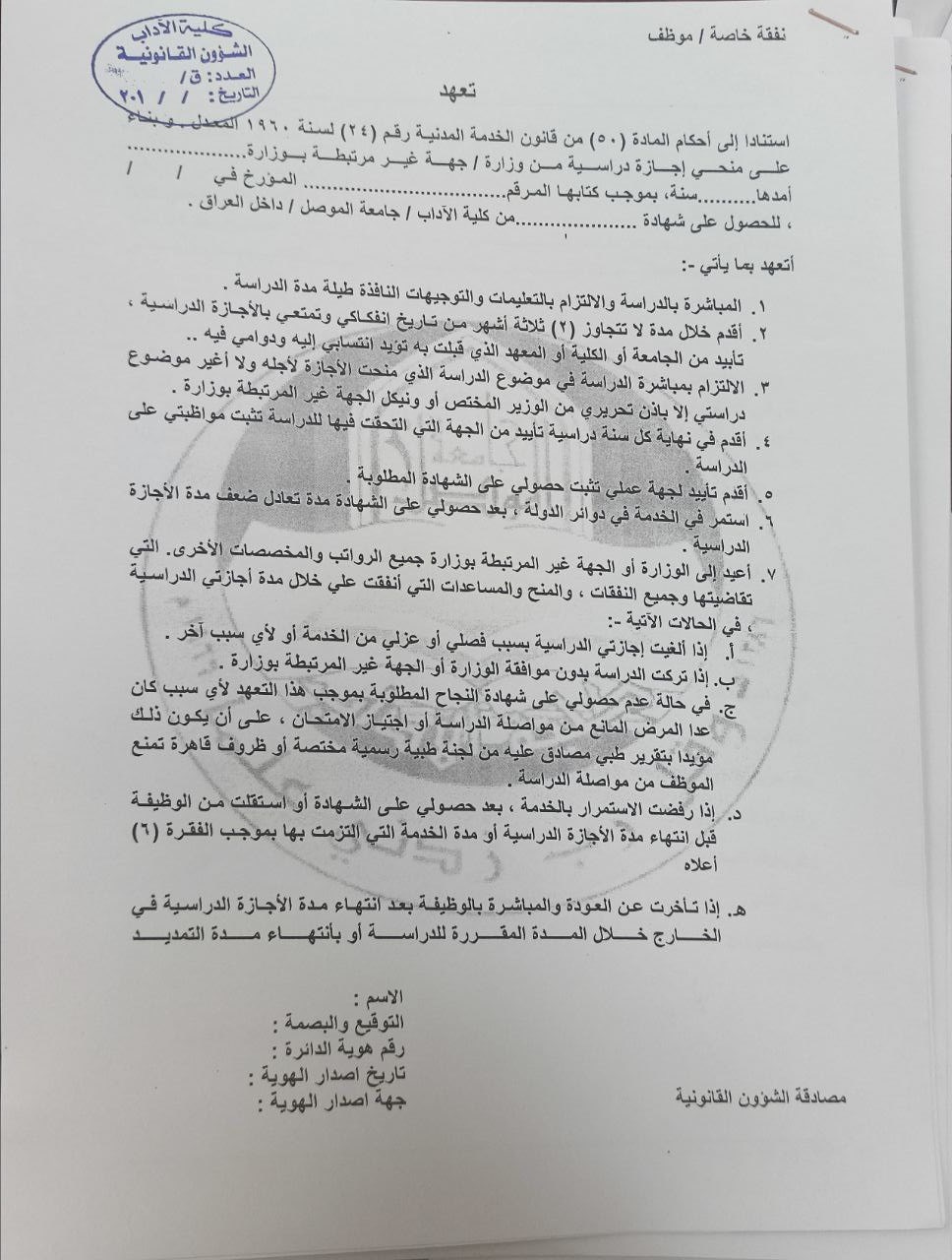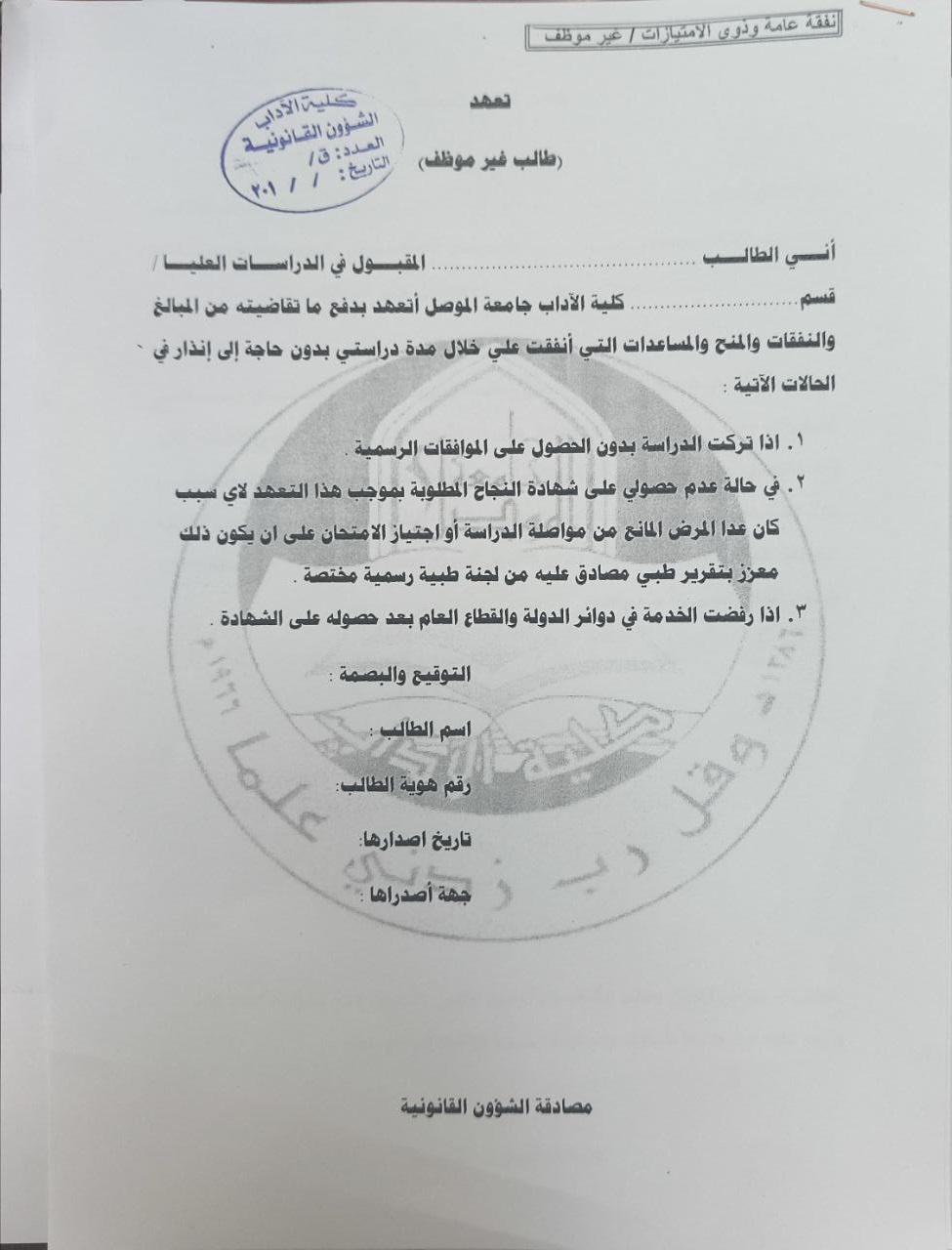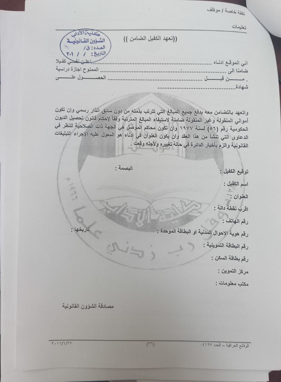 تُهيب كلية الآداب بالطلبة المقبولين في برامج الدراسات العليا، ( الذين صدرت أوامرهم الجامعية بالقبول )، بضرورة مراجعة الشعبة القانونية في الكلية للاطلاع على الأدلة الإرشادية الخاصة بالفئات المشمولة بإجراءات الكفالات والتعهدات القانونية، والمرفقة في المنشور أدناه.