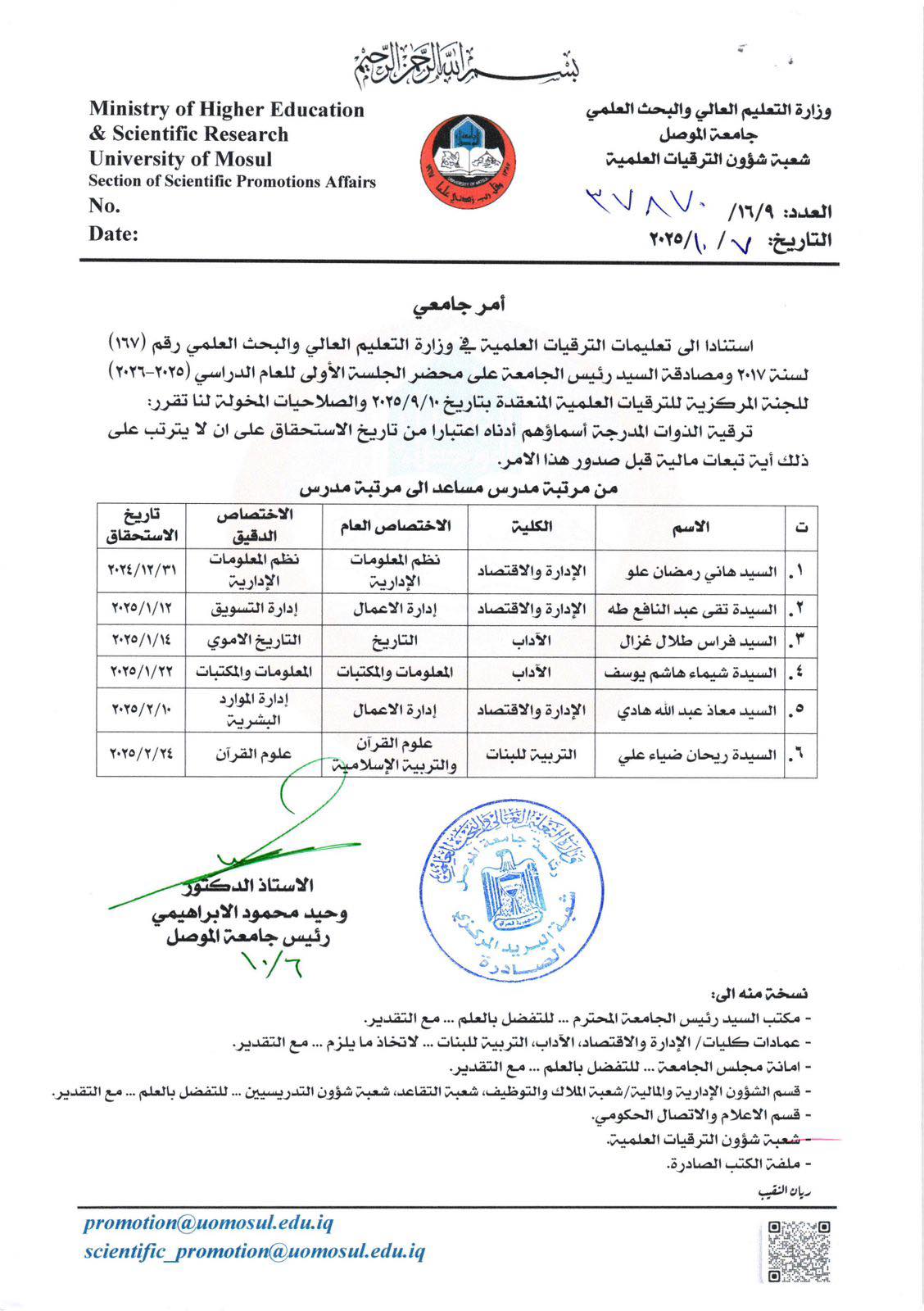 تتقدم أسرة كلية الآداب، ممثلة بعميدها الأستاذ الدكتور حاتم فهد هنو الطائي، بأجمل التهاني والتبريكات الى كل من: السيد فراس طلال غزال، والسيدة شيماء هاشم يوسف.بمناسبة ترقيتهما من مرتبة مدرس مساعد إلى مرتبة مدرس، متمنين لهما دوام التوفيق والنجاح في مسيرتهما الأكاديمية والعلمية.