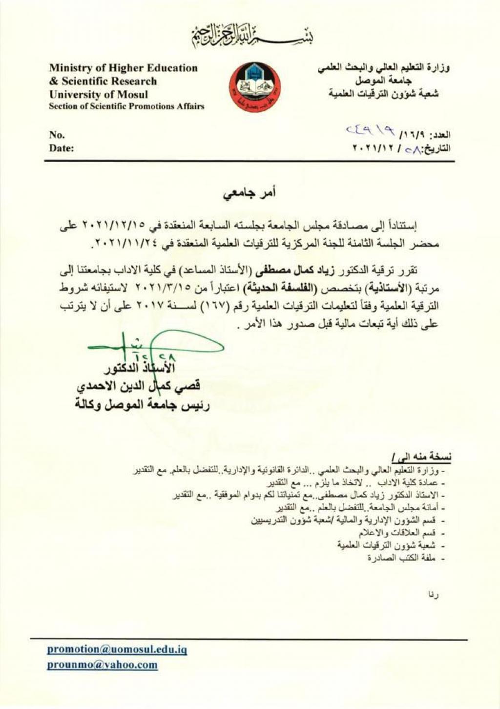 - ترقية الدكتور زياد كمال مصطفى من مرتبة (استاذ مساعد) الى مرتبة (استاذ) – قسم الفلسفة