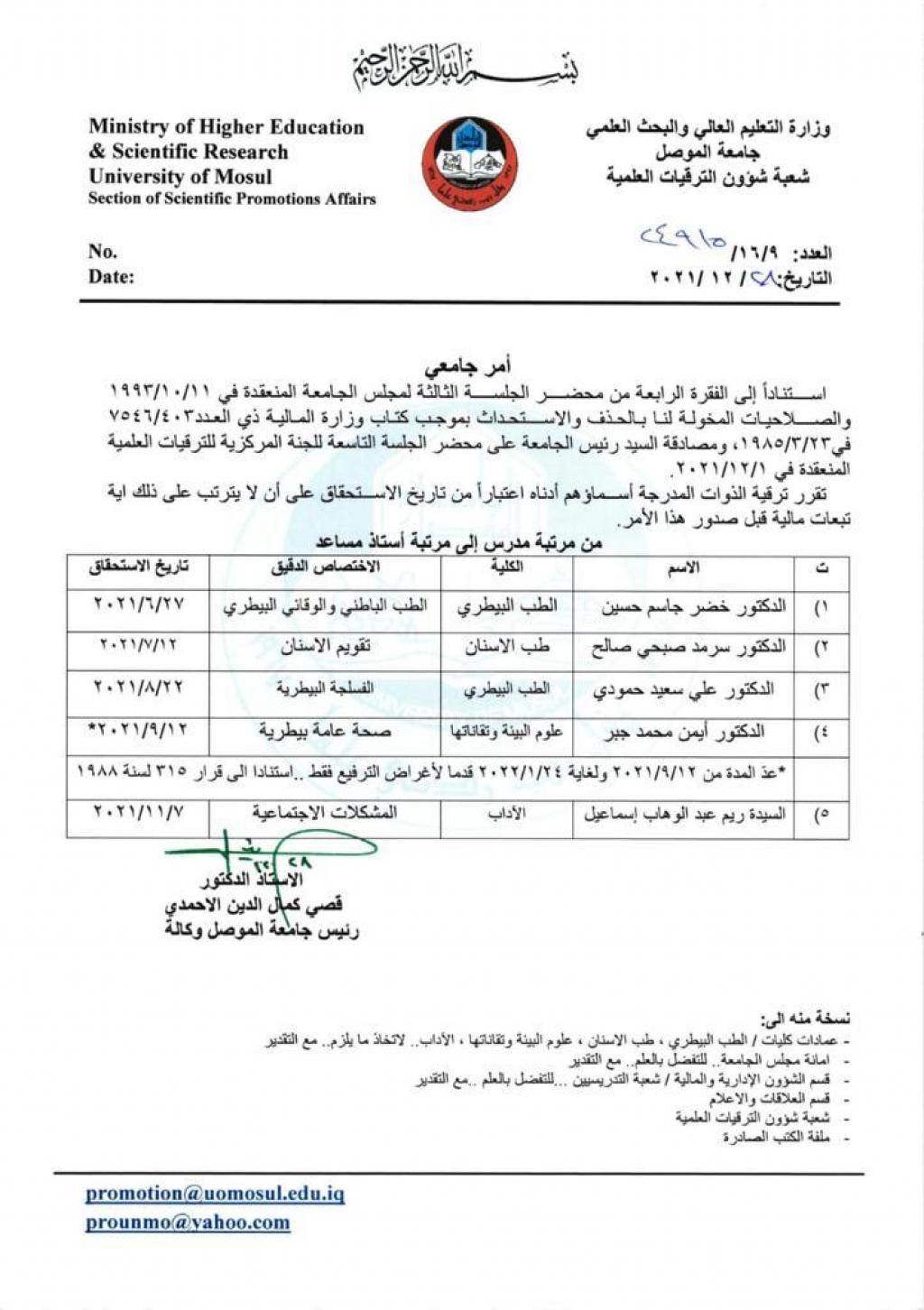 - ترقية السيدة ريم عبد الوهاب اسماعيل من مرتبة (مدرس) الى مرتبة (استاذ مساعد) – قسم علم الإجتماع