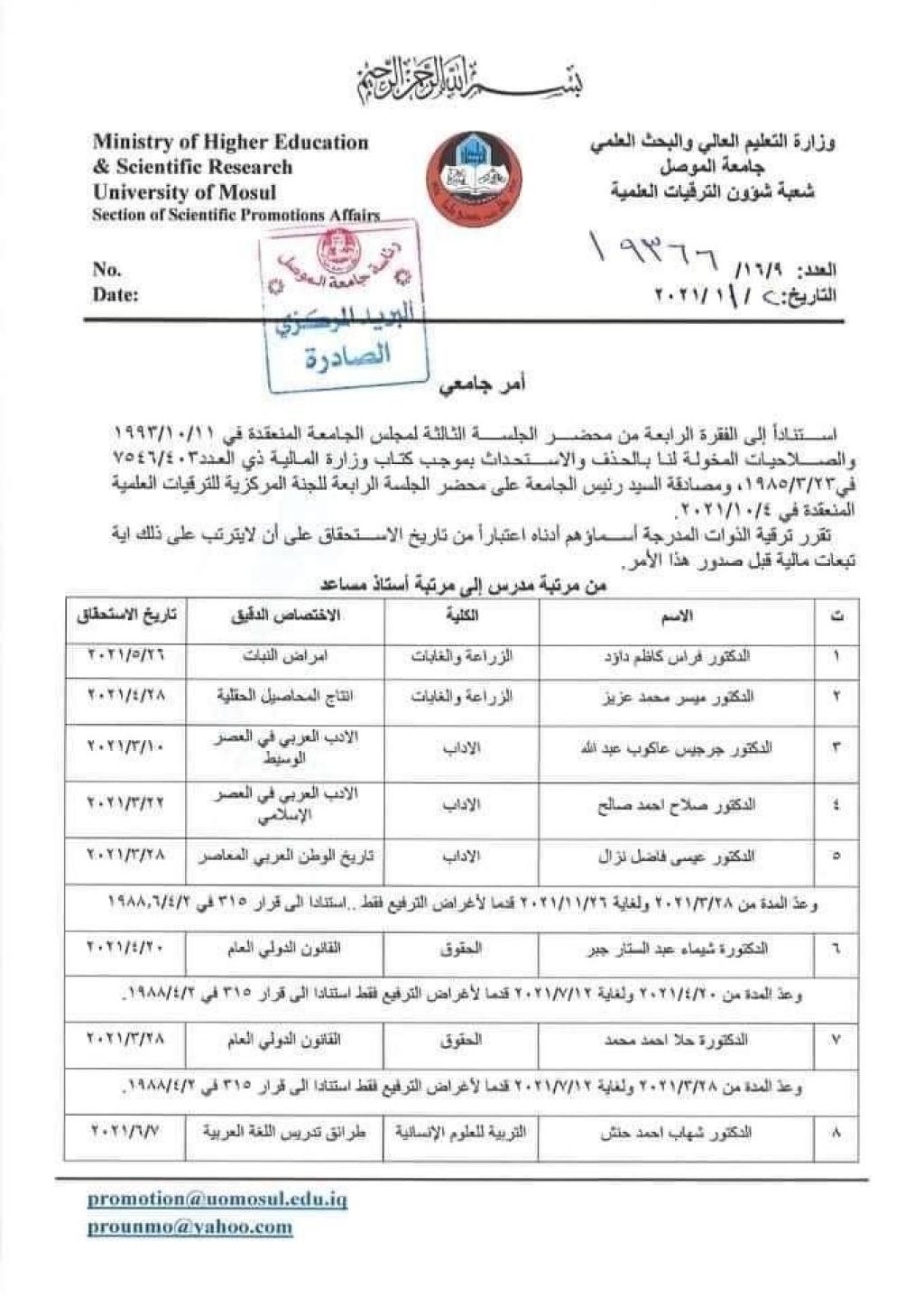 تهنئة ترقية لمجموعة من تدريسيي كلية الآداب