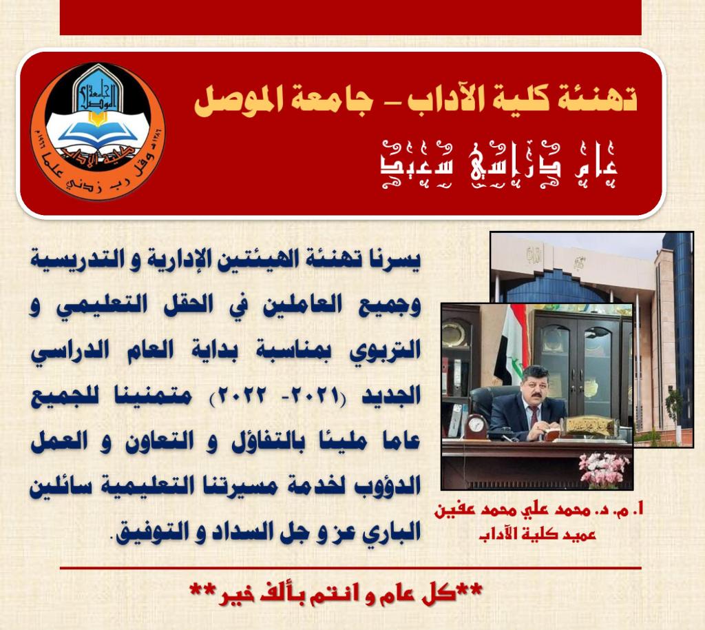 تهنئة كلية الآداب – جامعة الموصل – عام دراسي جديد