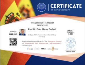 اختير الأستاذ الدكتور فراس عباس فاضل، التدريسي في قسم علم الاجتماع بكلية الآداب – جامعة الموصل، عضواً في هيئة تحرير مجلة European Journal of Humanities and Educational Advancements الدولية الصادرة في إسبانيا.