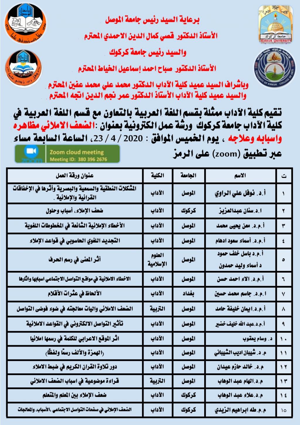 جامعة الموصل تقيم ورشة علمية الكترونية بالتعاون مع جامعة كركوك برعاية السيد رئيس جامعة الموصل الأستاذ الدكتور قصي كمال الدين الاحمدي المحترموالسيد رئيس جامعة كركوك الأستاذ الدكتور صباح احمد إسماعيل الخياط المحترموباشراف السيد عميد كلية الآداب الدكتور محمد علي محمد عفين المحترم والسيد عميد كلية الآداب الأستاذ الدكتور عمر نجم الدين اتجه المحترماقامت كلية الآداب ممثلة بقسم اللغة العربية بالتعاون مع قسم اللغة العربية في كلية الآداب جامعة كركوك ورشة عمل الكترونية بعنوان :الضعف الاملائي مظاهره واسبابه وعلاجه ، اليوم الخميس الموافق : 23 / 4 / 2020، الساعة السابعة مساء عبر تطبيق (zoom) ، وشهدت الورشة حضورا كبيرا اذ تجاوز الحضور 1150 متابعا ، وادار الورشة الكترونيا وتقديما السيد يحيى سعود ادهام ، في تقديم الورشة : أ.م.د. عبد الله خليف خضير الحياني ، وحاضر فيها كل من السادة المدرجة اسماؤهم فيما يأتي :أ.د. نوفل علي الراوي / جامعة الموصل كلية الآداب عنوان المحاضرة المشكلات النطقية والسمعية والبصرية وأثرها في الإخفاقات القرائية والإملائية ..د.سنان عبدالعزيز جامعة كركوك كلية الآداب عنوان المحاضرة ضعف الإملاء، أسباب وحلولأ.م.د. معن يحيى محمد / جامعة الموصل كلية الآداب عنوان المحاضرة الأخطاء الإملائية الشائعة في المخطوطات اللغويةأ.م.د. أسماء سعود ادهام/ جامعة الموصل كلية الآداب عنوان المحاضرة التجديد اللغوي الحاسوبي في قواعد الإملاءأ.م.د باسل خلف حمود ود أسماء وليد حمدون / جامعة الموصل العلوم الإسلامية عنوان المحاضرة أثر المعنى في رسم الحرفأ.م.د. الاء احمد حسن/ جامعة الموصل كلية الآداب عنوان المحاضرة الاخطاء الاملائية في مواقع التواصل الاجتماعي اسبابها واثارهاا.م.د. جاسم محمد حسين / جامعة بغداد كلية الآداب عنوان المحاضرة الألحاظ في عثرات الأقلامأ.م.د.ايمان خليفة حامد/ جامعة الموصل كلية عنوان المحاضرة الضعف الاملائي واليات معالجته في ضوء فوضى التواصلأ.م.د.عبد الله خليف خضير / جامعة الموصل كلية الآداب عنوان المحاضرة تأثير التواصل الالكتروني في القواعد الاملائيةد. وسام يعقوب / جامعة الموصل كلية الآداب عنوان المحاضرة اثر الموقع الاعرابي للكلمة في رسمها املائيام. د. شيبان اديب الشيباني/ جامعة الموصل كلية الآداب عنوان المحاضرة (الهمزة والألف رسمًا ولفظًا)م.د. خالد حازم عيدان/ جامعة الموصل كلية الآداب عنوان المحاضرة دور تلاوة القران الكريم في ضبط الاملاءم.د.الهام عبد الوهاب/ جامعة الموصل كلية التربية للعلوم الانسانية عنوان المحاضرة قراءة موضوعية في اسباب الضعف الاملائيم.د.علاء عبد الوهاب/ جامعة كركوك كلية الآداب عنوان المحاضرة ضعف الإملاء بين المعلم والمتعلمم.م.طه ابراهيم الزيدي/ جامعة كركوك كلية الآداب عنوان المحاضرة الضعف الإملائي في صفحات التواصل الاجتماعي ،الأسباب، والمعالجات