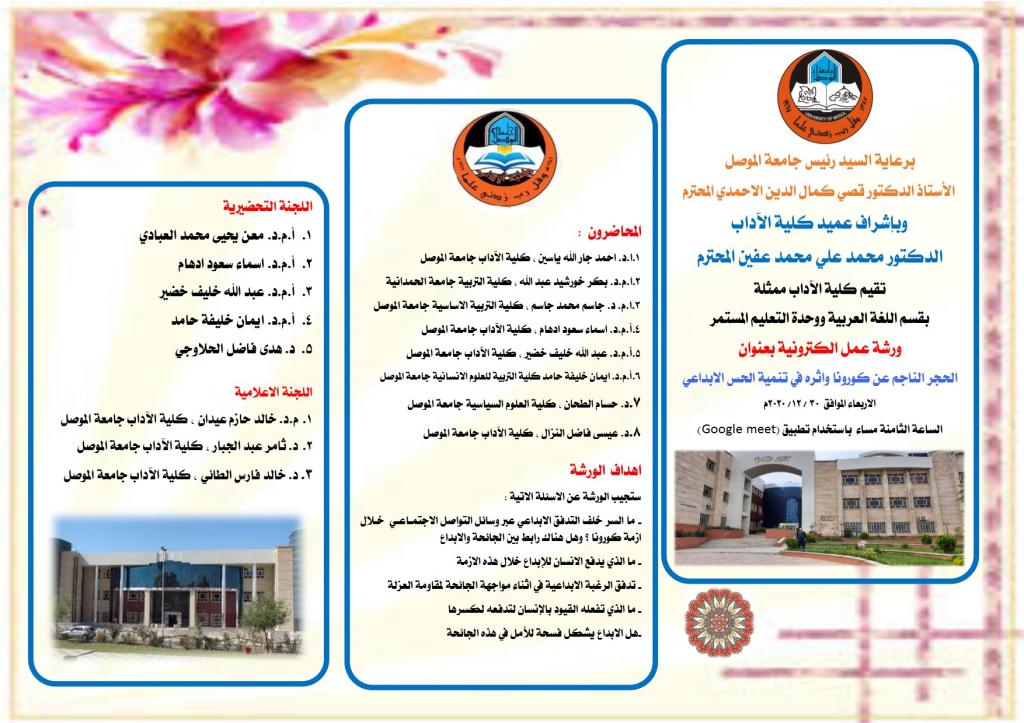 برعاية السيد رئيس جامعة الموصل الأستاذ الدكتور قصي كمال الدين الاحمدي المحترموبإشراف عميد كلية الآداب الدكتور محمد علي محمد عفين المحترماقامت كلية الآداب ممثلة بقسم اللغة العربية ووحدة التعليم المستمر ورشة عمل الكترونية بعنوان (الحجر الناجم عن كورونا واثره في تنمية الحس الابداعي) اليوم الاربعاء الموافق 30 / 12/ 2020م ، الساعة الثامنة مساء باستخدام تطبيق (Google meet) ، واتى هذا النشاط ليختم النشاطات العلمية لكلية الآداب لهذا العام الميلادي لندخل عاما جديدا نرجو ان يكون مليئا بالنشاطات العلمية كما كان العام السابق على الرغم من الحظر بسبب وباء كورونا.اهداف الورشةهدفت الورشة الى تسليط الضوء على قضايا مهمة واكبة ايام الحظر ، والكشف عن السر خلف التدفق الابداعي عبر وسائل التواصل الاجتماعي خلال ازمة كورونا والبحث عن الرابط بين الجائحة والابداع ، والدافع الذي يدفع الانسان للإبداع خلال هذه الازمة ، واليات مواجهة الحظر بسبب الجائحة منها تدفق الرغبة الابداعية في اثناء مواجهة الجائحة لمقاومة العزلة ، تفعله القيود بالإنسان لتدفعه لكسرها وكذلك البحث عن الابداع الذي يشكل فسحة للأمل في هذه الجائحةاللجنة التحضيريةأ.م.د. معن يحيى محمد العبادي ، كلية الآداب جامعة الموصلأ.م.د. اسماء سعود ادهام ، كلية الآداب جامعة الموصلأ.م.د. عبد الله خليف خضير، كلية الآداب جامعة الموصلأ.م.د. ايمان خليفة حامد ، كلية الآداب جامعة الموصلد. هدى فاضل الحلاوجي ، كلية الآداب جامعة الموصلالمحاضرون :ا.د. احمد جار الله ياسين ، كلية الآداب جامعة الموصلا.م.د. بكر خورشيد عبد الله ، كلية التربية جامعة الحمدانيةا.م. د. جاسم محمد جاسم ، كلية التربية الاساسية جامعة الموصلأ.م.د. اسماء سعود ادهام ، كلية الآداب جامعة الموصلأ.م.د. عبد الله خليف خضير ، كلية الآداب جامعة الموصلأ.م.د. ايمان خليفة حامد كلية التربية للعلوم الانسانية جامعة الموصلد. حسام الطحان ، كلية العلوم السياسية جامعة الموصلد. عيسى فاضل النزال ، كلية الآداب جامعة الموصلاللجنة الاعلاميةم.د. خالد حازم عيدان ، كلية الآداب جامعة الموصلد. ثامر عبد الجبار ، كلية الآداب جامعة الموصلد. خالد فارس الطائي ، كلية الآداب جامعة الموصل