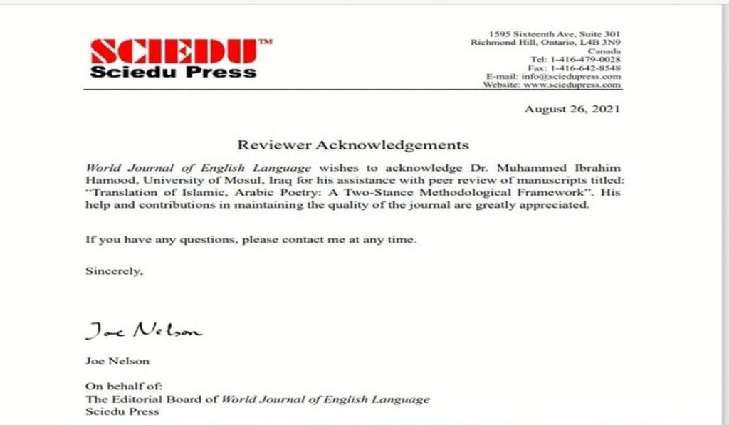 حصل الدكتور محمد إبراهيم حمود التدريسي في قسم الترجمة على كتاب شكر وتقدير من مجلة اللغة الانكليزية الكندية الدولية الرصينة وذات الجودة العالية ًWorld Journal of English Language” بعد تقيمه لبحث لغرض النشر في تلك المجلة.