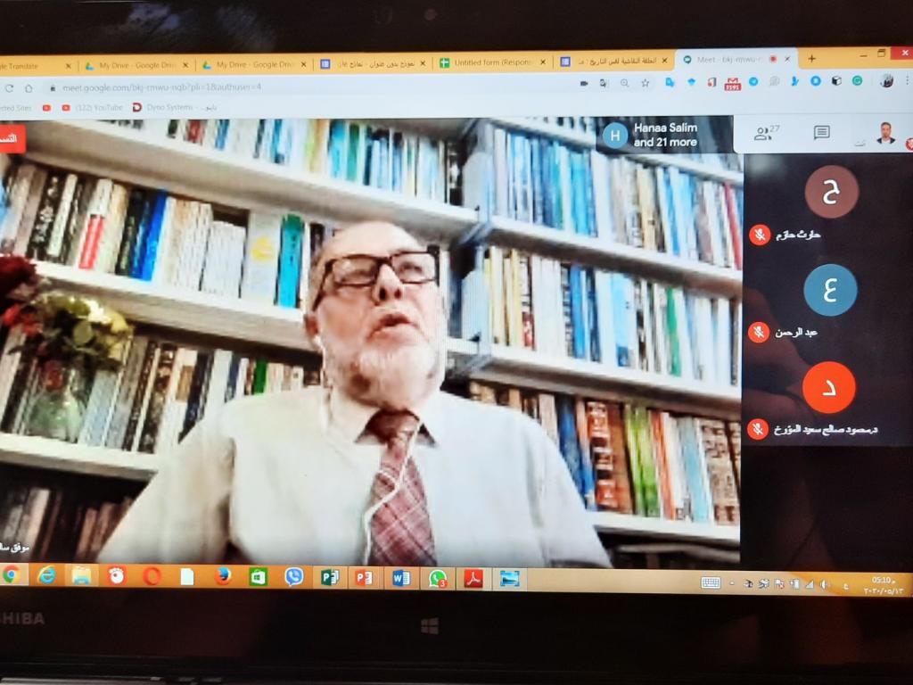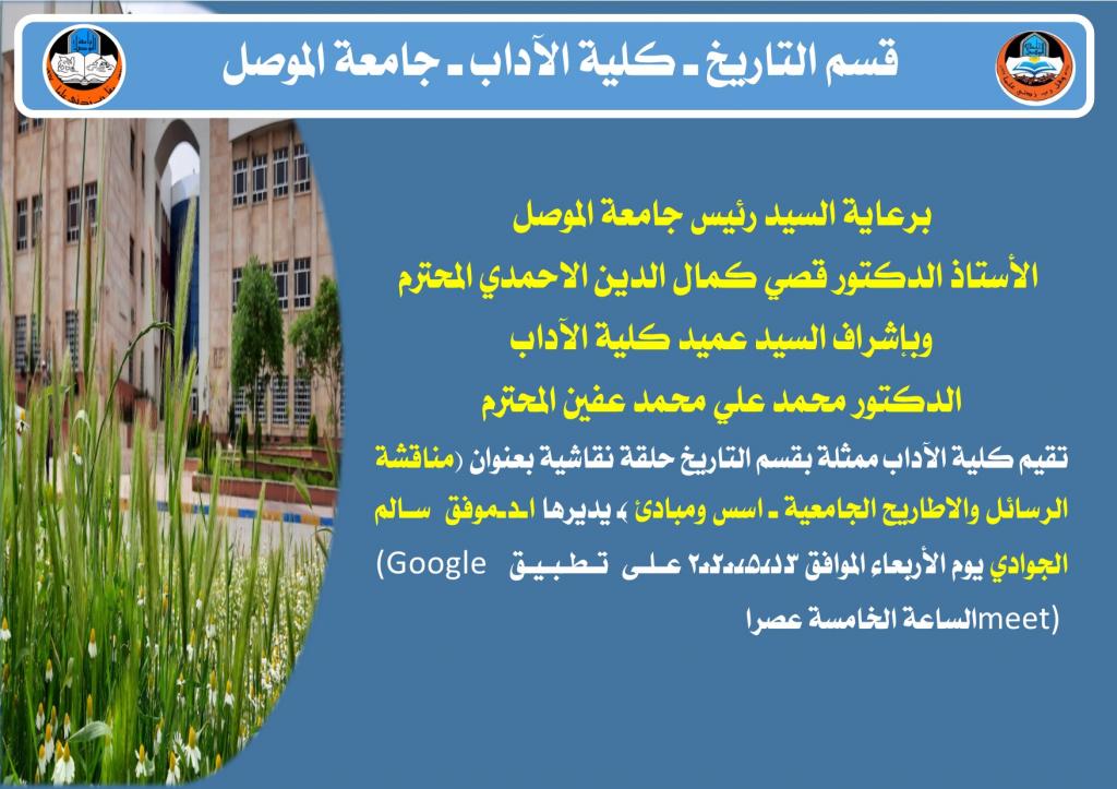 برعاية السيد رئيس جامعة الموصل الأستاذ الدكتور قصي كمال الدين الاحمدي المحترموبإشراف السيد عميد كلية الآداب الدكتور محمد علي محمد عفين المحترماقامت كلية الآداب ممثلة بقسم التاريخ حلقة نقاشية بعنوان (مناقشة الرسائل والاطاريح الجامعية ـ اسس ومبادئ) ، اليوم الأربعاء الموافق ٢٠٢٠/5/١٣ على تطبيق (Google meet) الساعة الخامسة عصرا ، تضمنت الحلقة محاضرة قدمها الاستاذ الدكتور موفق سالم الجوادي سبقها نبذة تعريفية بالاستاذ الدكتور موفق الجوادي قراءها أ.م.د.عبد الله خليف الحياني ، وكذلك كلمة الافتتاحية قدمها الاستاذ الدكتور حارث حازم ايوب معاون عميد كلية الآداب للشؤون العلمية ، واختتمت الحلقة بأسئلة كثيرة طرحت على الدكتور موفق سالم الجوادي اجاب عنها وناقشها .وشهدت الحلقة حضورا مميزا وكبيرا موضوع الحلقة النقاشية :تناولت الحلقة النقاشية قضية مهمة تتعلق بطلبة الدراسات العليا من طلبة وتدريسيين ، ذلك انها سلطة الضوء على الاسس والمبادئ في مناقشة الرسائل والاطاريح الجامعية وما يدور في هذه المناقشات من اجراءات واحداث يكون لها تأثير في مستقبل طلبة الدراسات العليا وكذلك واقعها في القسم المعني بتلك المناقشةاهداف الحلقة:هدفت الحلقة الى ايجاد حلول وتسليط الضوء على بعض المشاكل او ما قد تكون مشاكلا امام المناقش والطالب ، وقد تناولت الحلقة هذه المضامين من جوانب عدة لعل من اهمها : ان المناقشة هي اختبار حقيقي للتدريسي المناقش وليس للطالب اذ قد تكون معيارا لكشف علمية هذا التدريسي وخبراته المعرفية ، وكذلك هيكلية المناقشات واختيار المناقشين يجب ان تكون المناقشة مبنية على اسس علمية رصينة حتى لا تأخذ المناقشة منحى شخصيا او منحى يبعدها عن الاهداف العلمية، وكذلك الخطة والاعداد المسبق للمناقشات ، فضلا عن المبادى العامة التي ينبغي على الطالب والمناقشين معرفتها في اثناء المناقشة ، وان يتم البحث عن القيم العلمية للعمل ولا يكون التركيز على الطالب نفسه ، وكذلك معرفة القوانين والاجراءات الرسمية والالمام بها