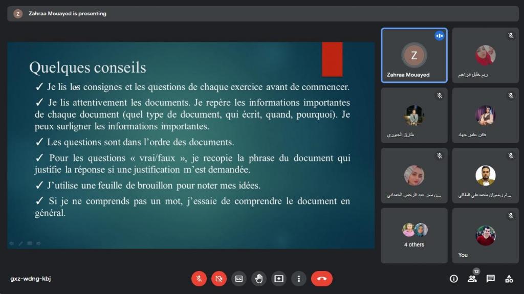 بأشراف السيد عميد كلية الآداب الدكتور محمد علي محمد عفين المحترم، أقامت كلية الآداب ممثلة بقسم اللغة الفرنسية وبالتعاون مع وحدة التعليم المستمر في الكلية ثلاث دورات تدريبية الكترونية مجانية لطلبة قسم اللغة الفرنسية عن آلية امتحان الديلف (DELF) للمستويات (A1, A2, B1) وبواقع أربعة أيام وثلاث ساعات يوميا لكل دورة على تطبيق Google Meet للفترة (24-29) حزيران 2022.هدفت الدورة الى اطلاع المشاركين على آلية وتعليمات امتحان الديلف (DELF) والتدريب على كيفية الاجابة عن اختبارات الاستيعاب الشفهي والاستيعاب التحريري والتعبير التحريري والتعبير الشفهي لكل مستوى من المستويات الثلاثة وقد شارك في الدورة طلبة من قسم اللغة الفرنسية بالاضافة الى عدد من الخريجين.