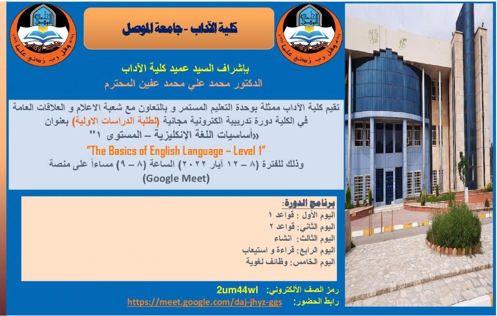 بإشراف السيد عميد كلية الآداب الدكتور محمد علي محمد عفين المحترم تقيم كلية الآداب ممثلة بوحدة التعليم المستمر و بالتعاون مع شعبة الاعلام و العلاقات العامة في الكلية دورة تدريبية الكترونية مجانية (لطلبة الدراسات الاولية) بعنوان «أساسيات اللغة الإنكليزية – المستوى 1»«The Basics of English Language – Level 1»وذلك للفترة (8 – 12 آيار 2022) الساعة (8 – 9) مساءاً على منصة (Google Meet)فعلى الراغبين بالمشاركة الإنضمام الى الصف الألكتروني ادناه:رمز الصف الألكتروني: 2um44wlرابط الحضور: https://meet.google.com/daj-jhyz-ggs