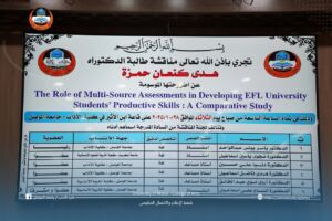 دور مصادر التقييم المتعددة في تطوير المهارات الإنتاجية لطلبة الجامعة الدارسين للغة الإنكليزية بوصفها لغة اجنبية: دراسة مقارنة، وذلك يوم الثلاثاء ٢٨ تشرين الاول ٢٠٢٥ حضر جانبا منها عميد الكلية الأستاذ الدكتور حاتم فهد الطائي ورئيس القسم الدكتور صالح عبدالله عبدالرحمن وعدد من تدريسيي الكلية.