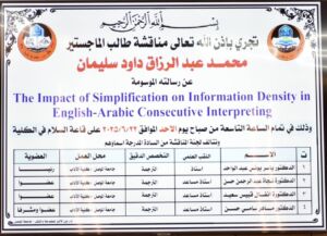 أثر التبسيط على كثافة المعلومات في الترجمة التتبعية بين الإنجليزية والعربية، وذلك يوم الأحد ٢٢ حزيران ٢٠٢٥ حضر جانبا منها الأستاذ الدكتور حاتم فهد الطائي عميد الكلية ورئيس القسم الدكتورة هالة خالد نجم وعدد من تدريسيي الكلية.
