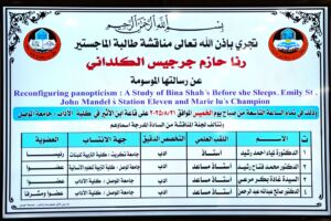 إعادة هيكلة البانوبتيكية: دراسة في روايات قبل أن تنام لبينا شاه، والمحطة الحادية عشرة لاميلي سانت جون ماندل، والبطل لماري لو، وذلك يوم الخميس ٢١ آب ٢٠٢٥ حضر جانبا منها الأستاذ الدكتور حاتم فهد الطائي عميد الكلية وعدد من تدريسيي الكلية.