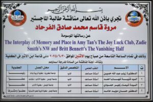 التداخل بين الذاكرة والمكان في رواية نادي الفرح والحظ (1989) لايمي تان، ورواية شمال غرب (2012) لزادي سميث، ورواية النصف المتلاشي (2020) لبريت بينيت، وذلك يوم الاثنين ٣٠ حزيران ٢٠٢٥ حضر جانبا منها الأستاذ الدكتور حاتم فهد الطائي عميد الكلية ورئيس القسم الدكتور صالح عبد الله وعدد من تدريسيي الكلية.