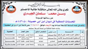 ناقش قسم اللغة العربية في كلية الآداب رسالة ماجستير عن المحسنات اللفظية في ديوان ابن أبي حُصينة (ت٤٥٦هـ) وذلك يوم الأربعاء ٣٠ تموز ٢٠٢٥ حضر جانبا منها الأستاذ الدكتور حاتم فهد الطائي عميد الكلية ورئيس القسم الدكتور أحمد صالح يونس وعدد من تدريسيي الكلية.