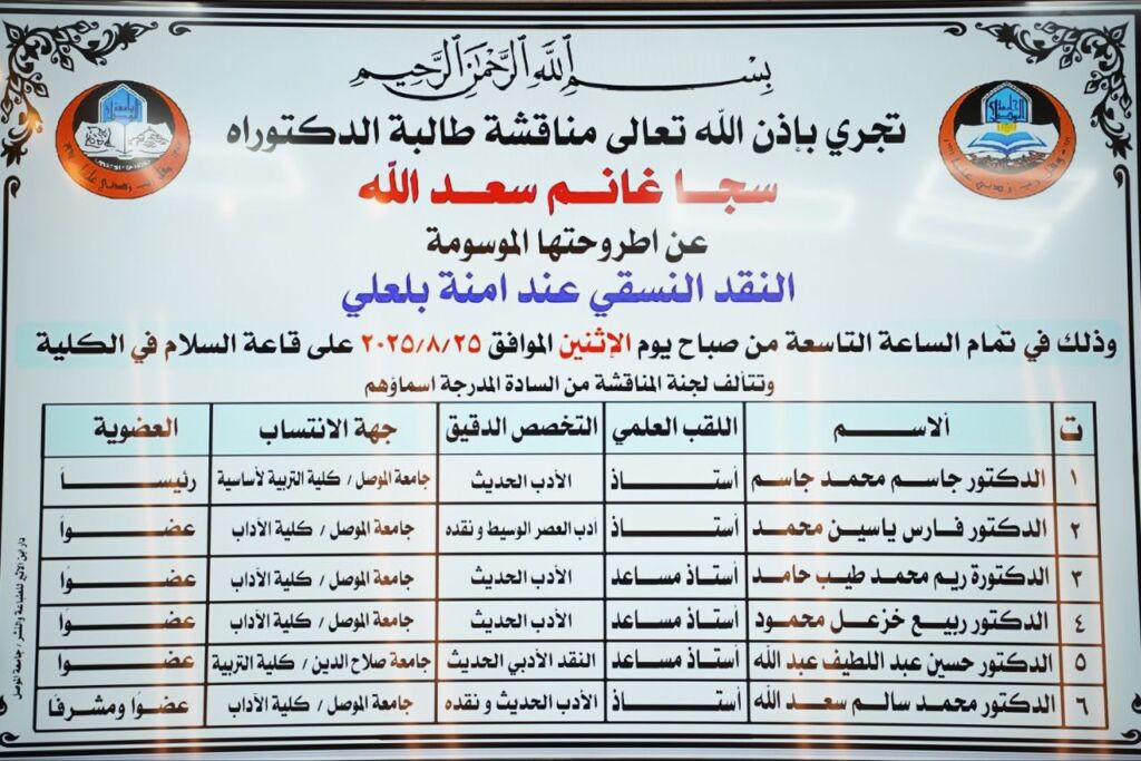 تحليل تداولي للتورية في مختارات من الروايات الإنكليزية الحديثة، وذلك يوم الإثنين ٢٥ آب ٢٠٢٥ حضر جانباً منها الأستاذ الدكتور حاتم فهد الطائي عميد الكلية ورئيس القسم الدكتور صالح عبدالله عبدالرحمن عدد من تدريسيي الكلية.