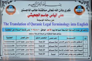 ترجمة المصطلحات الشرعية القرآنية إلى اللغة الإنكليزية، وذلك يوم الأحد ١٠ آب ٢٠٢٥ حضر جانبا منها الأستاذ الدكتور حاتم فهد الطائي عميد الكلية ورئيس القسم الدكتورة هالة خالد نجم وعدد من تدريسيي الكلية.