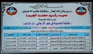 ناقش قسم اللغة العربية في كلية الآداب رسالة ماجستير عن خاتمة القصيدة في شعر الأرجاني (ت ٥٤٤ هـ)، وذلك يوم الأربعاء ١٣ آب ٢٠٢٥ حضر جانباً منها الأستاذ الدكتور حاتم فهد الطائي عميد الكلية ورئيس القسم الأستاذ الدكتور احمد صالح يونس وعدد من تدريسيي الكلية.