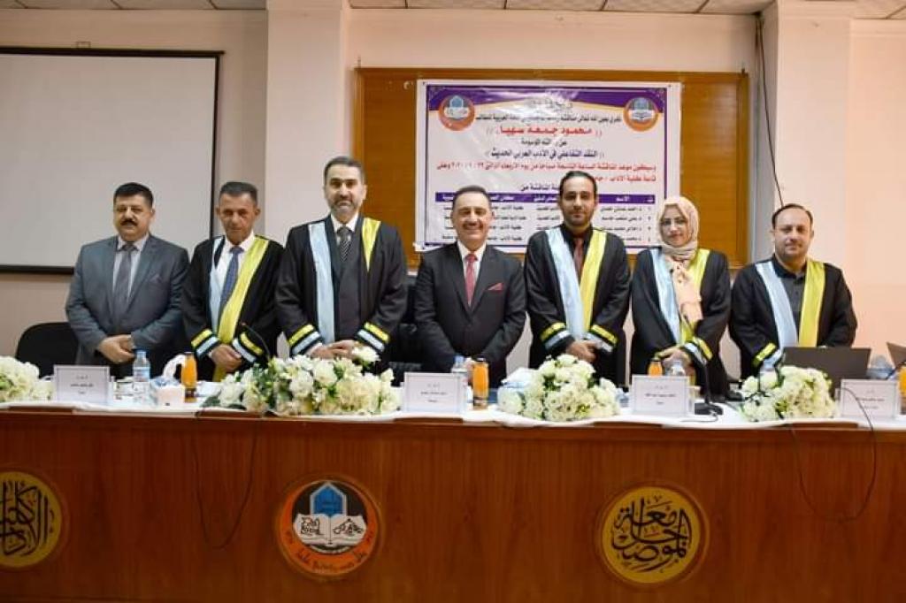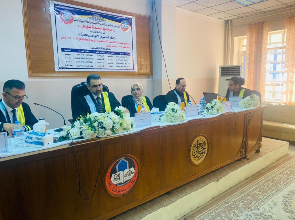 ناقش قسم اللغة العربية في كلية الآداب بجامعة الموصل رسالة ماجستير عن “النقد التفاعلي في الأدب العربي الحديث،” يوم (الاربعاء) الموافق 22 أيلول 2021، حضر جانبا منها الاستاذ الدكتور قصي الدين الاحمدي رئيس جامعة الموصل و الاستاذ المساعد الدكتور محمد عفين عميد الكلية و معاونيه العلمي الاستاذ الدكتور حارث حازم و الاداري الاستاذ المساعد الدكتور صفوان ناظم مع رئيس قسم اللغة العربية الاستاذ الدكتور معن يحيى العبادي وعدد من تدريسيي الكلية .