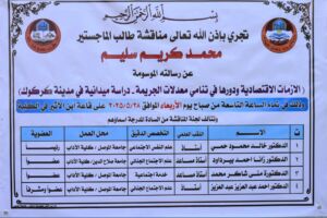 ناقش قسم علم الإجتماع في كلية الآداب رسالة ماجستير بعنوان ” الأزمات الاقتصادية ودورها في تنامي معدلات الجريمة دراسة ميدانية في مدينة كركوك، ” يوم الإثنين 28 آيار 2025، حضر جانباً منها الأستاذ الدكتور حاتم فهد الطائي عميد الكلية، ورئيس القسم الأستاذ الدكتور فراس عباس فاضل وعدد من تدريسيي الكلية.