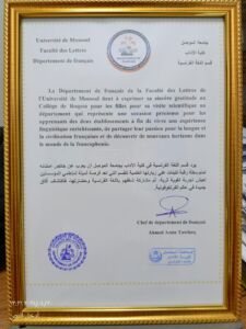 هدفت الزيارة العلمية الى تحفيز تعلم اللغة الفرنسية من قبل الطالبات في المتوسطتين. وفي خلال الزيارة حضرن الطالبات احدى محاضرات التواصل الشفاهي. كما التقين باساتذة القسم وزرن مكتبة قسم اللغة الفرنسية ورافقهن في الزيارة المدرس سعد ساجد فتاح.