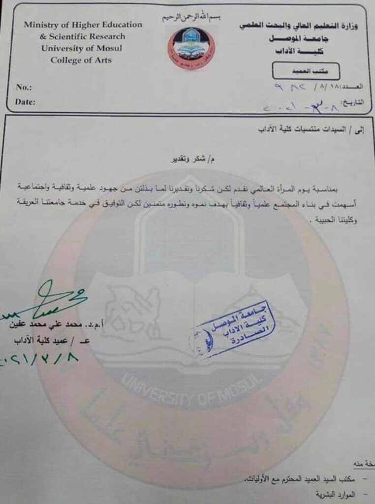 #شكروتقدير_بمناسبة يوم_المرأة_العالمي#كرّم السيد عميد كلية الاداب الاستاذ المساعد الدكتور محمد علي محمد عفين المحترم جميع منتسبات كلية الاداب بكتاب شكر وتقدير بمناسبة يوم المرأة العالمي ، تقديرآ منه لجهود المرأة في مجال العمل وألاخلاص في تأدية الواجبات المناطة اليها