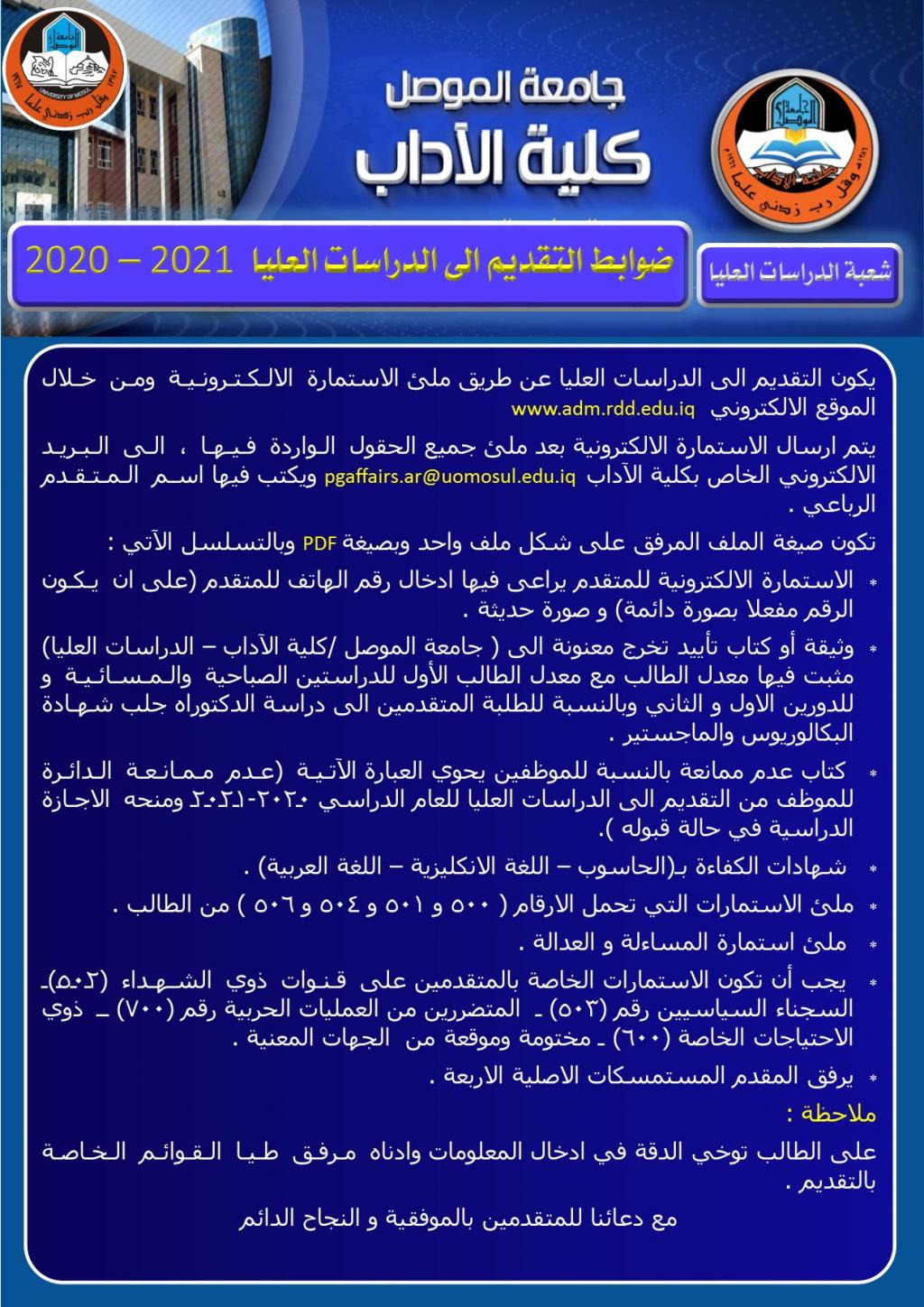 السلام عليكم ورحمة الله وبركاتهفيما يأتي ضوابط التقديم الى الدراسات العليا 2020 ـ 2021 وكذلك الاستمارات المطلوبة للتقديميبدأ يوم 1 / 9/ 2020 وينتهي يوم 30/ 9 /2020اضغط على الرابط للحصول على استمارات التقديم رابط الملف المرفق