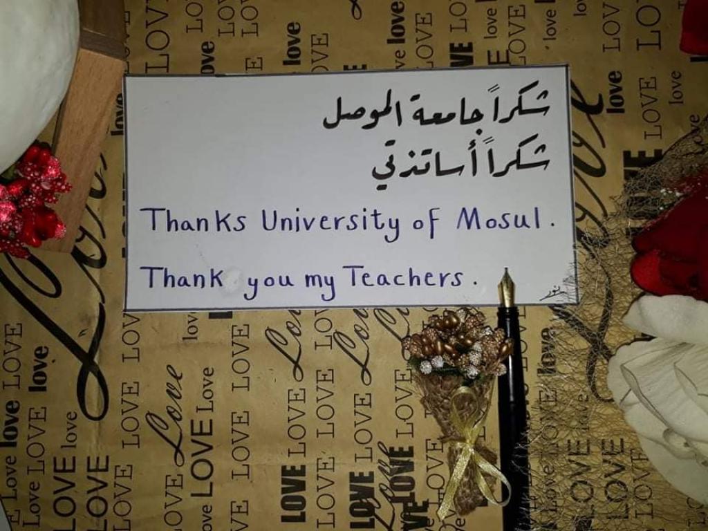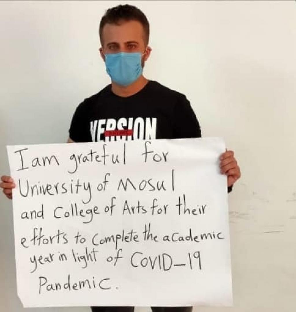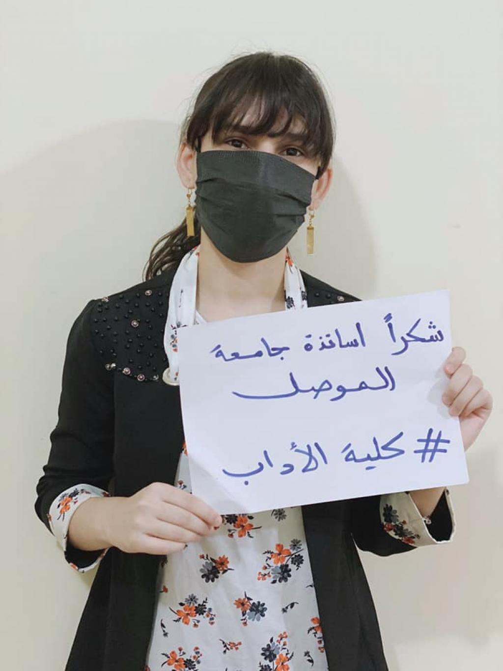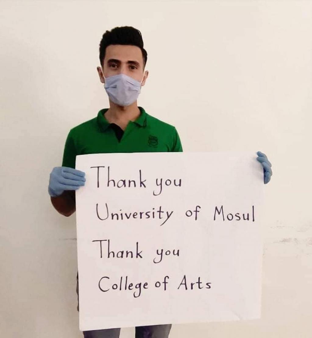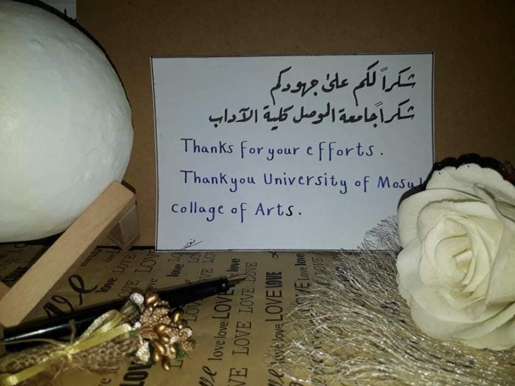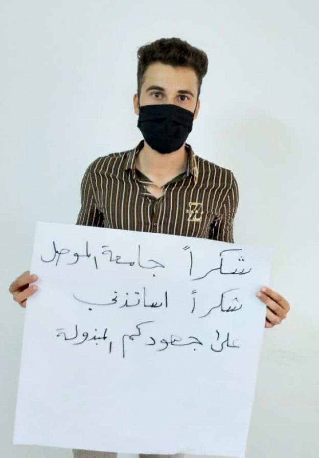 بمبادرة جميلة من طلاب وطالبات كلية الآداب بشكر وتثمين جهود أساتذة جامعة الموصل عامة وكلية الآداب خاصة بطريقة جميلة وراقية وذلك بكتابة عبارات الشكر والتقدير باللغتين العربية والانكليزية على جهودهم في إتمام العام الدراسي والامتحانات الالكترونية ومتابعتهم وحرصهم على الطلبة في ظل انتشار فايروس كورونا.وافر الشكر والتقدير لما بذلوه من جهود ومبارك النجاح والتفوق لجامعتنا ولجميع الطلبة.
