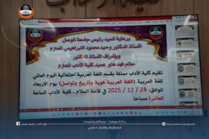 برعاية السيد رئيس جامعة الموصل الأستاذ الدكتور وحيد الإبراهيمي، وبحضور السيد عميد كلية الآداب الأستاذ الدكتور حاتم فهد هنو الطائي، أقام قسم اللغة العربية في كلية الآداب، اليوم الأربعاء الموافق ٢٠٢٥/١٢/٢٤، احتفالية مميزة بمناسبة يوم الضاد.