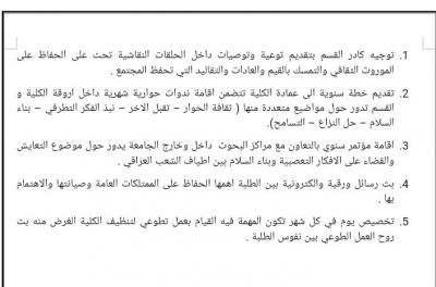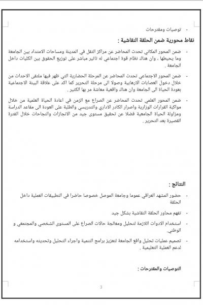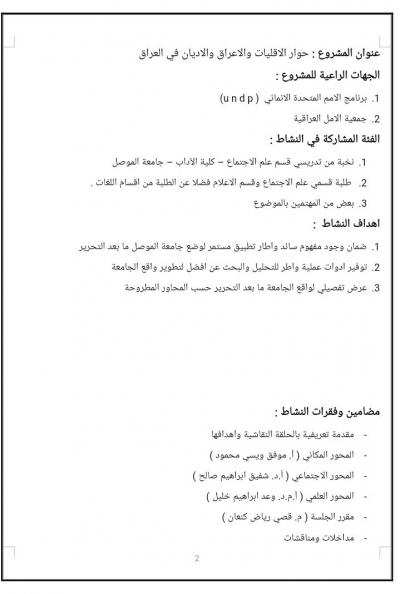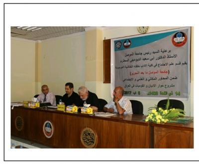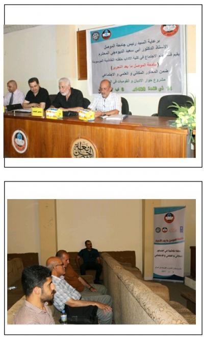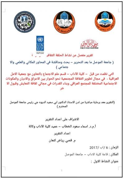 برعاية رئيس جامعة الموصل الاستاذ الدكتور أبي سعيد الديوه چي، وبإشراف مباشر من وكيل عميد الكلية الدكتورة اسماء سعود الخطاب، وحضور السادة التدريسيين وطلبة قسمي علم الاجتماع والاعلام فضلا عن الطلبة من اقسام اللغات في الكلية، والمدعوين وذوي الاختصاص، نظم قسم علم الاجتماع في كلية الاداب جامعة الموصل صباح يوم الاحد الموافق 6 آب 2017 وعلى قاعة مكتبة الكلية في الموقع الرئيس للجامعة في الموصل وبالتعاون مع جمعية الامل العراقية في مجال تطوير الثقافة المجتمعية نحو الحوار بين الاعراق والاديان والمكونات الاجتماعية المختلفة للمجتمع العراقي وبناء القدرات في مجالي ثقافة التعايش وقبول الآخر، حلقة ثقافية بعنوان (جامعة الموصل ما بعد التحرير – بحث ومناقشة المحاور المكاني والعلمي والاجتماعي) .حيث كان عنوان المشروع "حوار الاقليات العراقية والاعراق والاديان في العراق" وكانت الجهات الراعية للمشروع:1. برنامج الأمم المتحدة الإنمائي undp.2. جمعية الامل العراقية.وكان الهدف من اقامة الحلقة هو:• حماية وجود مفهوم سائد واطار تطبيق مستمر لوضع جامعة الموصل مابعد التحرير .• توفير ادوات علمية واطر للتحليل والبحث عن افضل لتطوير واقع جامعة الموصل.• عرض تفصيلي لواقع الجامعة ما بعد التحرير حسب المحاور المطروحة.