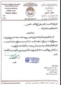 كتاب شكر من عميد كلية الآداب لتدريسيي وموظفي الكلية..