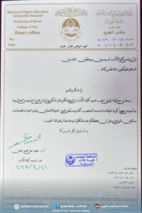كتاب شكر وتقدير من عميد كلية الآداب إلى اساتذة وموظفين الكلية بمناسبة انتهاء مهام تكليفه عميدا لكلية الاداب.