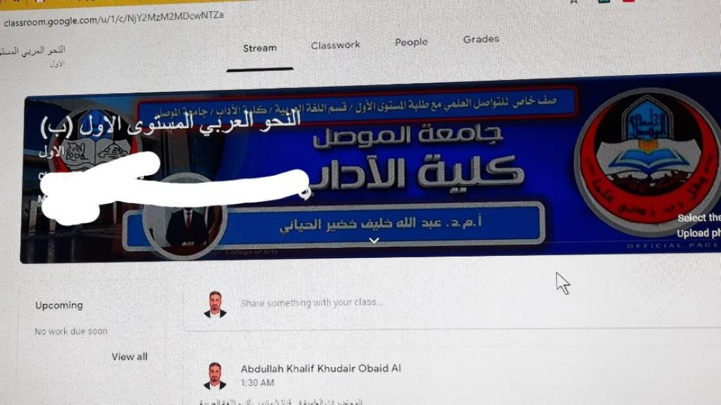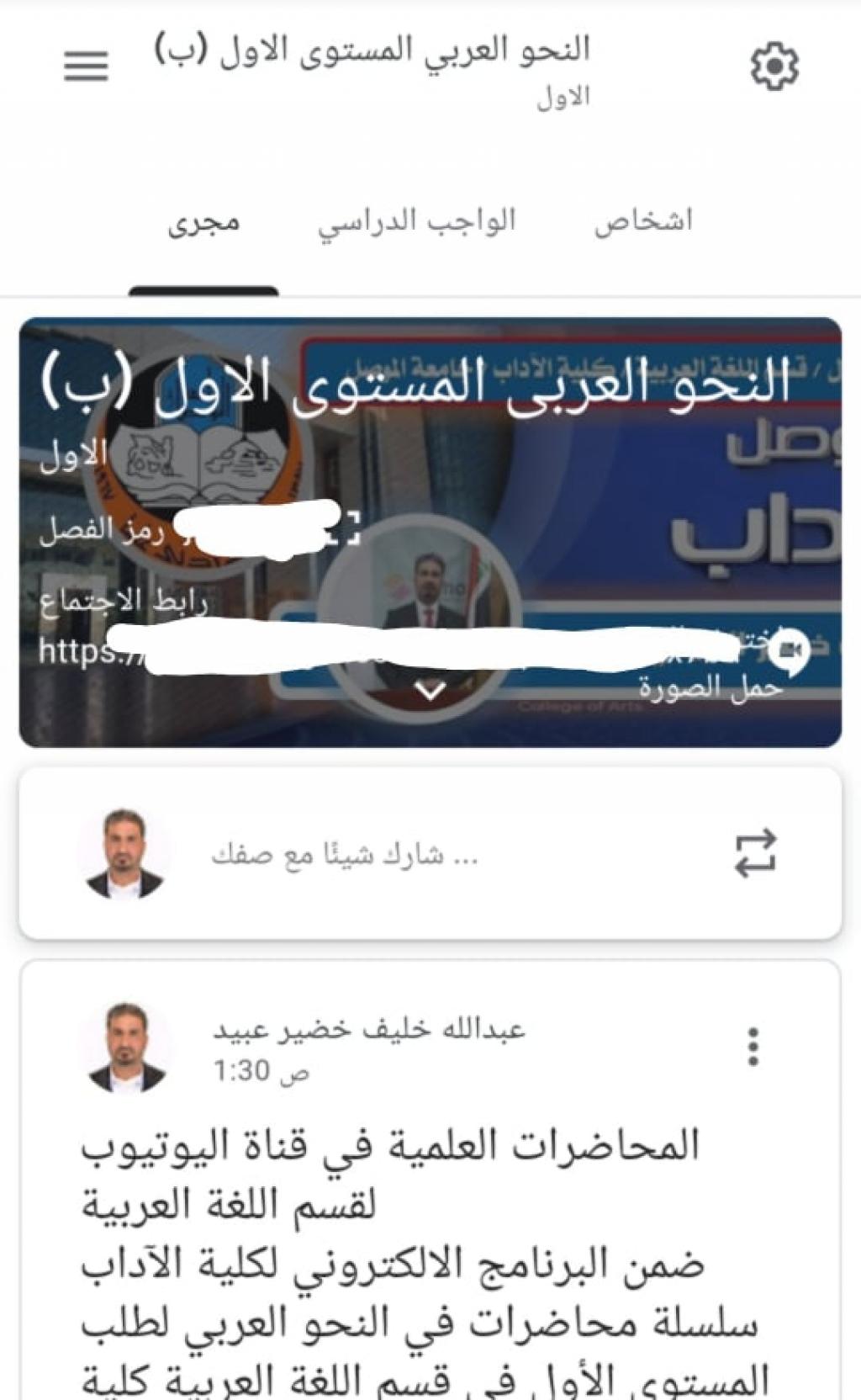 لقاء مجموعة من طلبة قسم اللغة العربية في برنامج (Google meet)التقى أ.م.د. عبد الله خليف خضير الحياني التدريسي في قسم اللغة العربية بمجموعة من طلبة الصف الأول (ب) وعلى رأسهم ممثل الشعبة صالح عبد مصطفى ، وعباس عصام ، ومصطفى طلب سامي ، ونغم راكان عزيز ، وامنة مقداد سعيد واستمر اللقاء لأكثر من ساعة في برنامج (Google meet) الذي تم ربطه بصف (Google Classroom) ، تناول اللقاء سبل اجراء الاختبارات الناجحة وعملية إيصال المحاضرات للطلبة وكذلك المعوقات ونقاط الضعف في المحاضرات السابقة واختيار افضل طريقة لإيصال المادة العلمية وتم الاتفاق مع الطلبة على عقد لقاءات مماثلة ودورية لتوضيح الإجابات او سوء الفهم في الدروس المقدمة بعد قراءتهم للمادة العلمية في صف (Google Classroom) والاطلاع على الفيديو المرافق لها وابدى الطلبة امنيتهم بالعودة القريبة الى مقاعد الدراسة كما ابدوا رغبتهم بالتعلم وفهم المواد فهمما جيدا اولا واخرا وكذلك تحدي عزلة (كورونا) وحظرها عبر التواصل الالكتروني وكان اللقاء مثمرا بكل معنى الكلمة ، فتحية طيبة لطلبة كلية الآداب