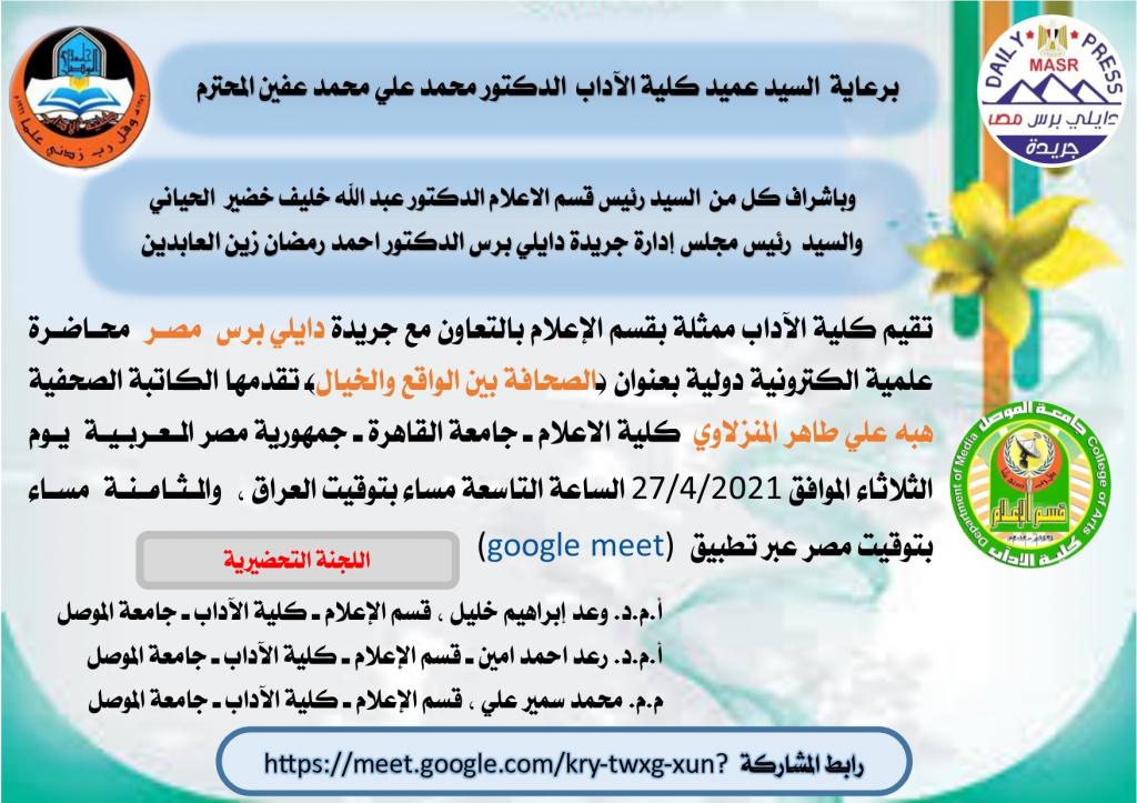 برعاية السيد عميد كلية الآداب الدكتور محمد علي محمد عفين المحترموباشراف كل من السيد رئيس قسم الاعلام الدكتور عبد الله خليف خضير الحيانيوالسيد رئيس مجلس إدارة جريدة دايلي برس الدكتور احمد رمضان زين العابديناقامت كلية الآداب ممثلة بقسم الإعلام بالتعاون مع جريدة دايلي برس مصر محاضرة علمية الكترونية دولية بعنوان (الصحافة بين الواقع والخيال) قدمتها الكاتبة الصحفية هبه علي طاهر المنزلاوي كلية الاعلام ـ جامعة القاهرة ـ جمهورية مصر العربية اليوم الثلاثاء الموافق 27/4/2021 عبر تطبيق (google meet) ، ادار الحوار وجلسة المحاضرة أ.م.د. رعد احمد امين ـ قسم الإعلام ـ كلية الآداب ـ جامعة الموصلرابط شهادات الحضوررابط الملف المرفق شهادات الحضور والمشاركةاللجنة التحضيريةأ.م.د. وعد إبراهيم خليل ، قسم الإعلام ـ كلية الآداب ـ جامعة الموصلم.م. محمد سمير علي ، قسم الإعلام ـ كلية الآداب ـ جامعة الموصلاهداف المحاضرةتحاول هذه المحاضرة تطوير الجانب الصحافي لدى طلبة قسم الاعلام ـ كلية الآداب ، فضلا عن مد جسور التعاون مع المؤسسات الإعلامية العربية والاطلاع على الأسس والمبادئ التي تنتهجها تلك المؤسسات للإفادة منها في الجانب العملي والتطبيقي للطلبة فضلا عن فتح افق المعرفة لدى الطلبة كما ان المحاضرة سيتخللها نقاشات واسئلة وهذا بدوره يتيح الفرصة لدى الطلبة في إقامة حوارات مفتوحة مع مؤسسات إعلامية عربية قد تفتح المجال امام مشاريع إعلامية وتعاون علمي فيما يتقدم من أيام