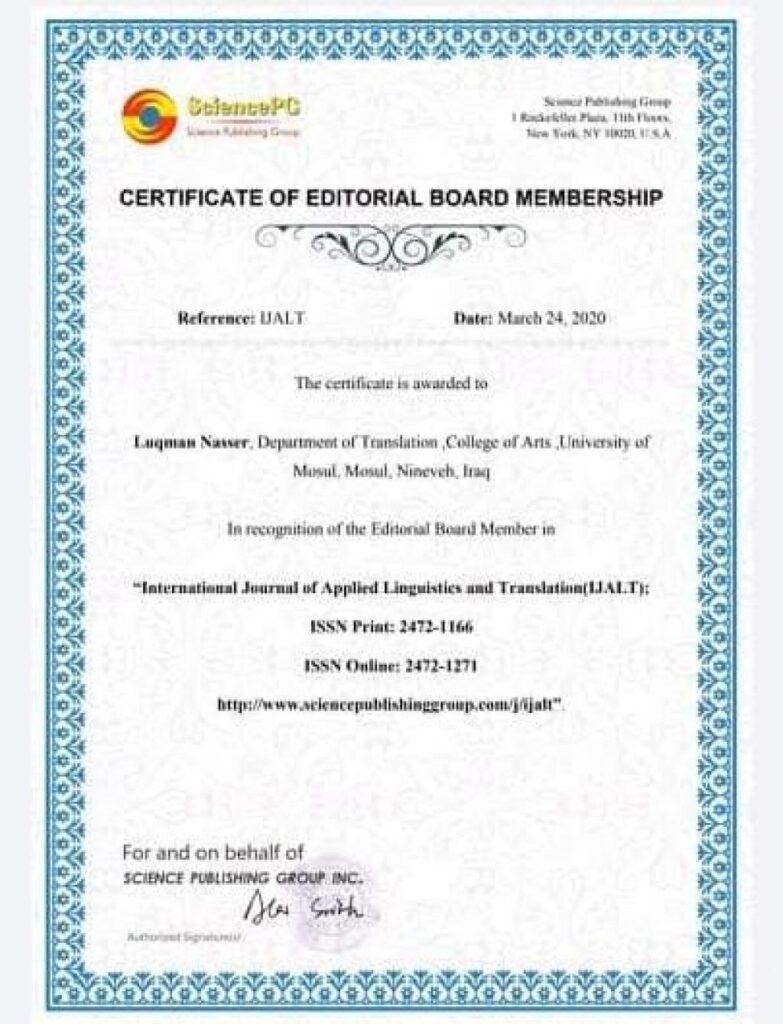 عضوية في هيئة تحرير مجلة International journal of Applied Linguistics and translation