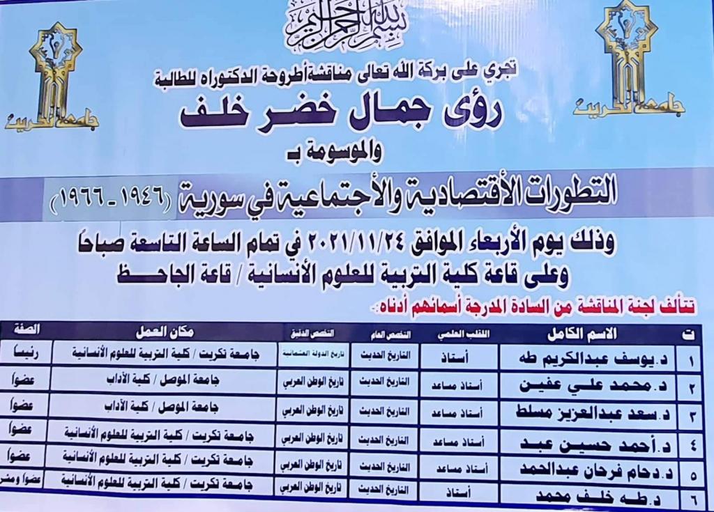 شارك الاستاذ المساعد الدكتور محمد علي محمد عفين – قسم التأريخ كعضو في لجنة مناقشة اطروحة الدكتوراه الموسومة (التطورات الاقتصادية و الاجتماعية في سورية (1946 -1966 )) على قاعة الجاحظ في كلية التربية للعلوم الإنسانية بجامعة تكريت يوم (الاربعاء) الموافق ٢٣ تشرين الثاني ٢٠٢١.هدفت الدراسة الى توضيح التطورات الاقتصادية و الاجتماعية في سورية للفترة الممتدة من 1946 الى 1966.