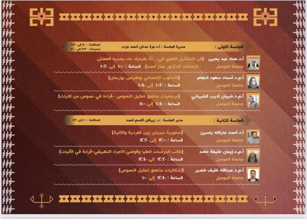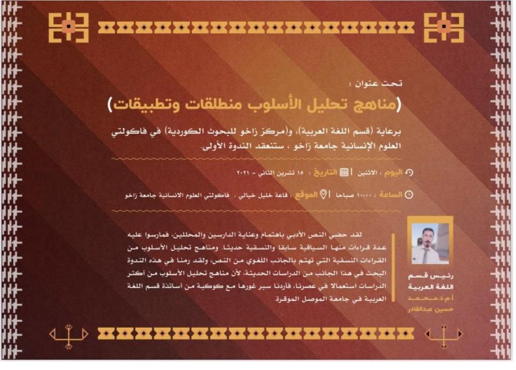 شارك نخبة من تدريسيي قسم اللغة العربية بالتعاون مع مركز زاخو للبحوث الكردية في كلية العلوم الانسانية – جامعة زاخو بندوة علمية تحت عنوان “مناهج تحليل الاسلوب منطلقات و تطبيقات،” يوم (الاثنين) الموافق 15 تشرين الثاني 2021 على قاعة خليل خيالي في كلية العلوم الإنسانية بجامعة زاخو.هدفت الندوة الى توضيح مناهج تحليل الأسلوب التي تعتبر من القراءات الحديثة التي تهتم بالجانب اللغوي و من اكثر الدراسات استعمالا في عصرنا.تضمنت الندوة العلمية جلستين، حاضر في الجلسة الاولى بإدارة الاستاذ الدكتور عزة عدنان عزة احمد، الاستاذ الدكتور عماد عبد يحيى (فن التشكيل اللغوي – انا بغيابك ما يضنه العطش- التماعات للدكتور عمار احمد) والاستاذ المساعد الدكتور اسماء سعود ادهام (الاسلوب الإحصائي و مقياس بوزيمان) و الاستاذ المساعد الدكتور شيبان اديب الشيباني (مرجعيات مناهج تحليل النصوص – قراءة في نصوص من التراث).و حاضر في الجلسة الثانية بإدارة الدكتور زيرفان قاسم احمد، الاستاذ الدكتور احمد جار الله ياسين (اسلوبية سبيتزر بين الفردية و الكلية)، الاستاذ المساعد الدكتور ايمان خليفة حامد (طالب الدراسات العليا و فوضى الإجراء التطبيقي – قراءة في الآليات) و الاستاذ المساعد الدكتور عبدالله خليف خضير (اشكالية مناهج تحليل النصوص).