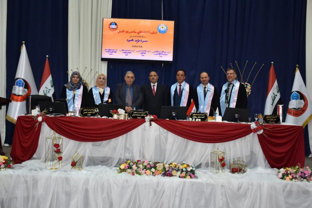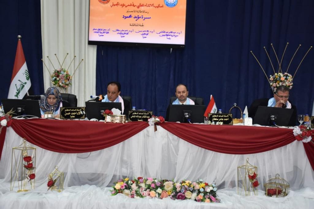 مشاركة تدريسية في قسم اللغة العربية كعضو مناقشة لرسالة ماجستير في كلية التربية للبنات عن اساليب الانشاء الطلبي في شعر مؤيد الجميلي