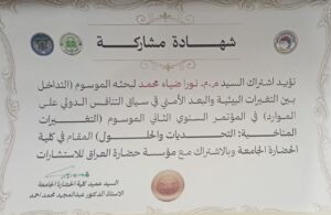 شاركت المدرس المساعد نور ضياء محمد، التدريسية في قسم علم الاجتماع – كلية الآداب / جامعة الموصل، في أعمال المؤتمر العلمي الثاني الذي نظمته كلية الحضارة الجامعة تحت عنوان “التغيرات المناخية: التحديات والحلول”.