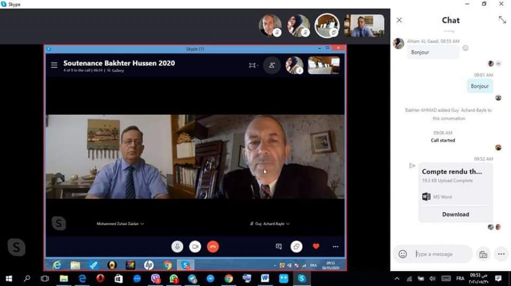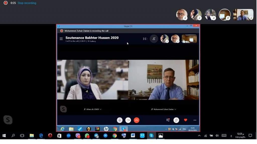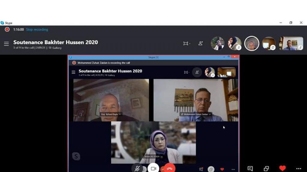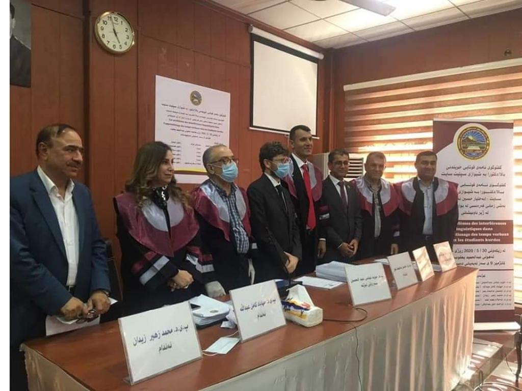 شارك التدريسيان في كلية الآداب ، أ. د. مؤيد عباس عبد الحسن ود. محمد زهير يوم السبت الموافق 30 أيار 2020 عبر تقنية “Skype” بصفة عضو في لجنة مناقشة أطروحة دكتوراه بجامعة صلاح الدين (اربيل) قدمها الباحث بختيار حسين أحمد وحملت عنوان:””Les problèmes des interférences linguistiques dans l’apprentissage des temps verbaux chez les étudiants kurdes””مشاكل التداخل اللغوي في تعلم الازمنة الفعلية لدى الطلبة الكرد”نظمت جلسة المناقشة برئاسة أ. د. مؤيد عباس عبد الحسن (جامعة الموصل)، وعضوية كل من د. محمد زهير (جامعة الموصل) ، أ.م.د. مهاباد كامل عبد الله (جامعة حلبجة)، أ.م.د. محسن احمد عمر(جامعة صلاح الدين)، أ.م.د. أحلام نعمة لفتة (الجامعة المستنصرية) بالاضافة إلى عضوية الإشراف المشترك لكل من أ.م .د. ابراهيم عبدالباقي (جامعة صلاح الدين) وأ. م. د. جي أشار بيل (جامعة اللورين-فرنسا). إستغرقت جلسة المناقشة أكثر من خمس ساعات وحصل فيها الباحث على تقدير “جيد جدا”. وقد حظيت هذه المناسبة بتغطية إعلامية واسعة وحضرتها شخصيات محلية وأجنبية، إذ تعد أول أطروحة دكتوراه تناقش داخل إقليم كردستان في ميدان اللغة الفرنسية وآدابها.Notre participation via “Skype” en tant que Membre du Jury de Soutenance d’une thèse de Doctorat à l’Université de Salahaddin (Erbil). Il s’agit d’une étude présentée par M. Bakhtiar Hussain Ahmed et intitulée:”Les problèmes d’interférences linguistiques dans l’apprentissage des temps verbaux chez les étudiants kurdes”Le Jury de cette soutenance s’est composé de : Prof. Dr. Moayad Abbas Abdul Hassan -Président- (Université de Mossoul), M. C. Dr. Mahabad Kamel Abdullah -Membre- (Université de Halabja), M.C. Dr. Mohsen Ahmed Omar-Membre- (Université Salahuddin), M.C. Dr. Ahlam Neama Lafta -Membre- (Université Al-Mustansiriya), M.C. Dr. Ibrahim Abdel-Baqi -Co-directeur-(Université de Salah al-Din) et M.C. Dr . Guy Acahrd Bayle -Co-directeur- (Université de Lorraine-France). La séance a duré plus de cinq heures et le chercheur y a acquis la mention «Très bonne». Cet événement a connu une importante présence de personnalités locales et étrangères ainsi que celle des médias puisque c’est la première thèse de doctorat soutenue au sein de la Région du Kurdistan d’Irak dans le domaine de Langue et de Littérature Françaises.