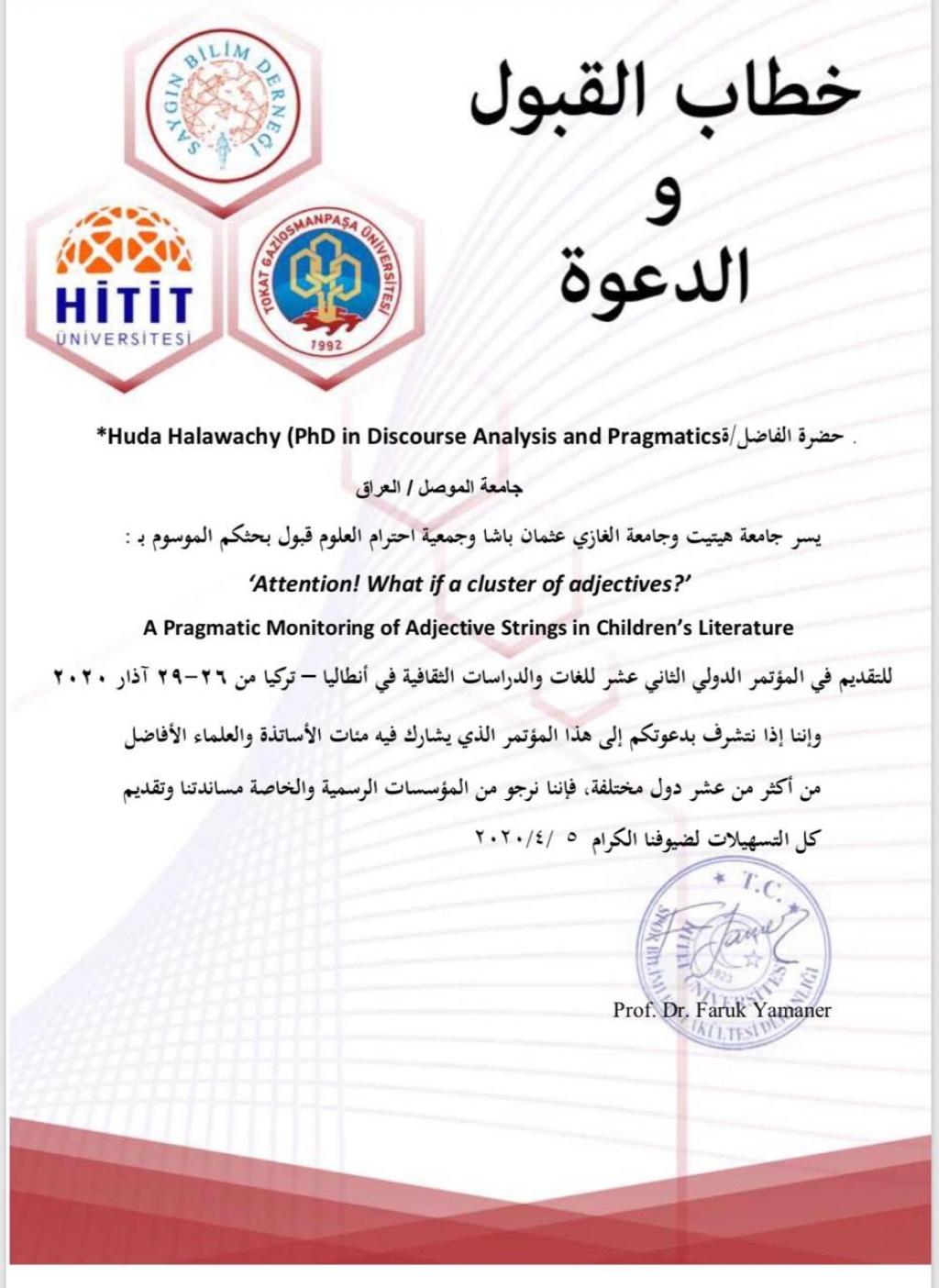 مشاركة في مؤتمر علمي دوليحصلت كل من م.د.هدى الحلاوجي و أ.م.دنيا علي حسين على رسالة قبول لبحثهما المشترك الموسوم بـ(‏‘Attention! What if a cluster of adjectives?’A Pragmatic Monitoring of Adjective Strings in Children’s Literature) فضلا عن حصولهما على دعوة للمشاركة في المؤتمر الدولي الثاني عشر للغات والدراسات الثقافية في أنطاليا-تركيا.